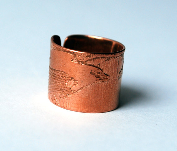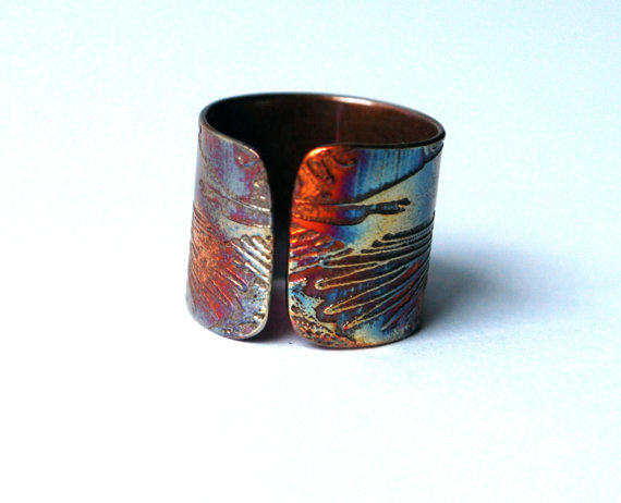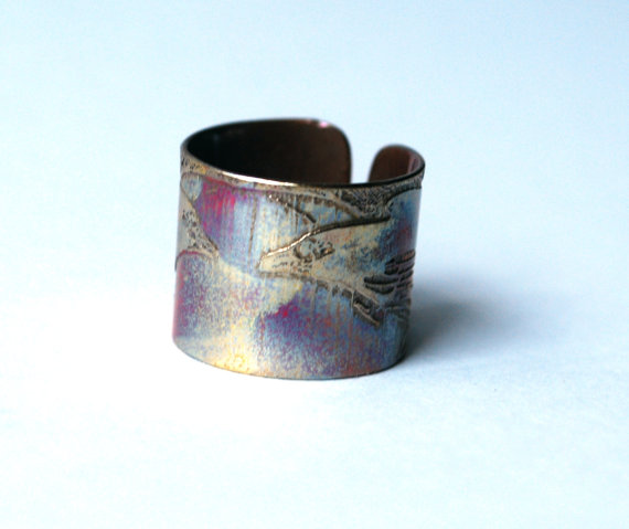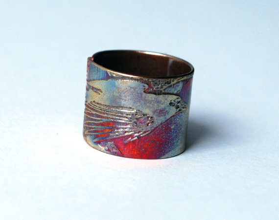 This etched copper ring is etched with a double raven motif. It is open at the back, allowing them to be adjusted to size. The copper is etched using non toxic processes, hand cut and formed using traditional jewellery tools. This etched copper ring can be pinched or stretched to size. It comes in natural copper or heat coloured to create a vibrant multicoloured patina: (this will deepen over time.)
