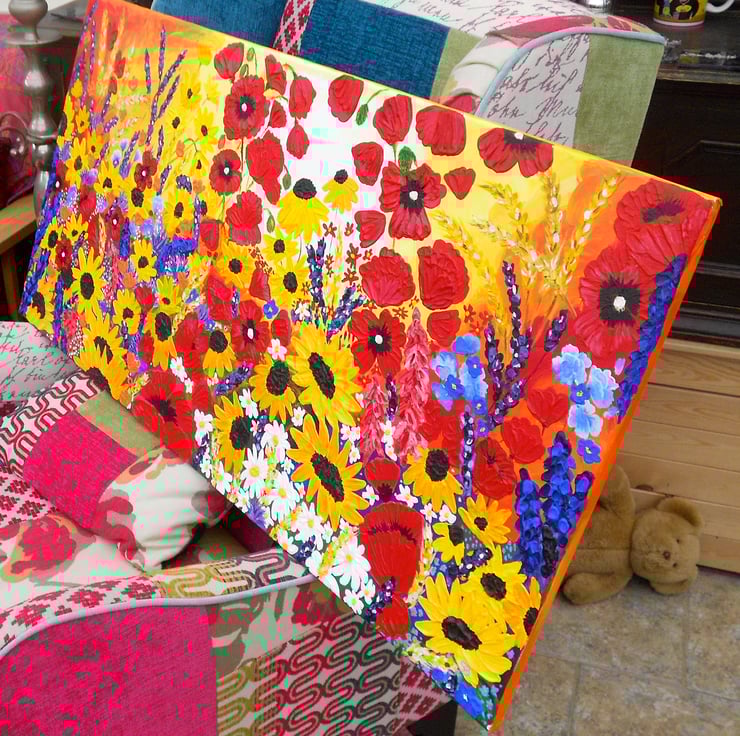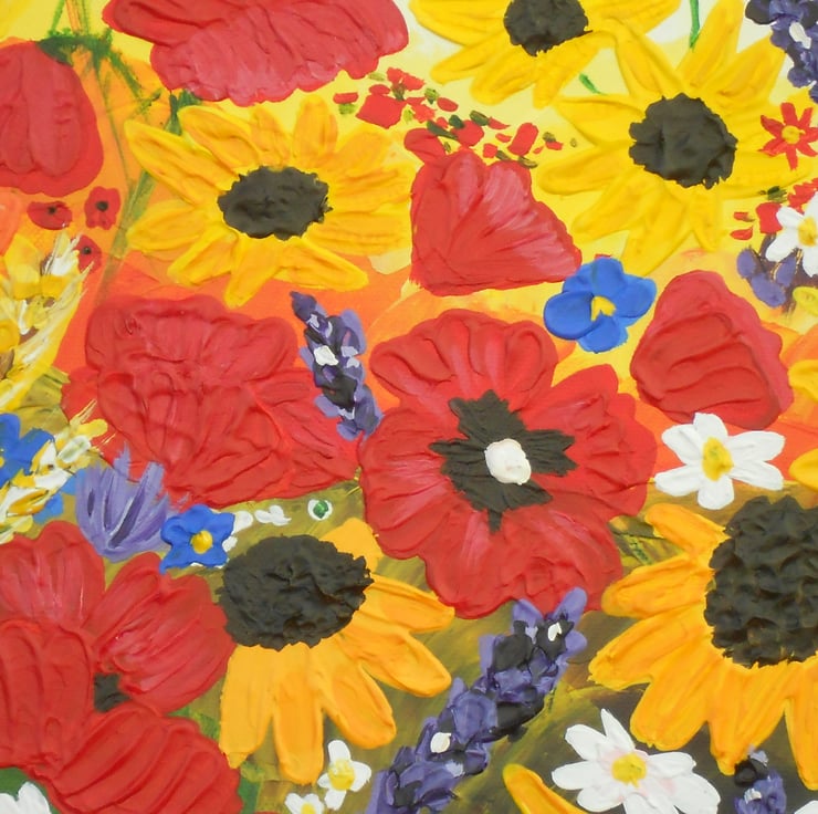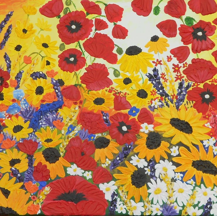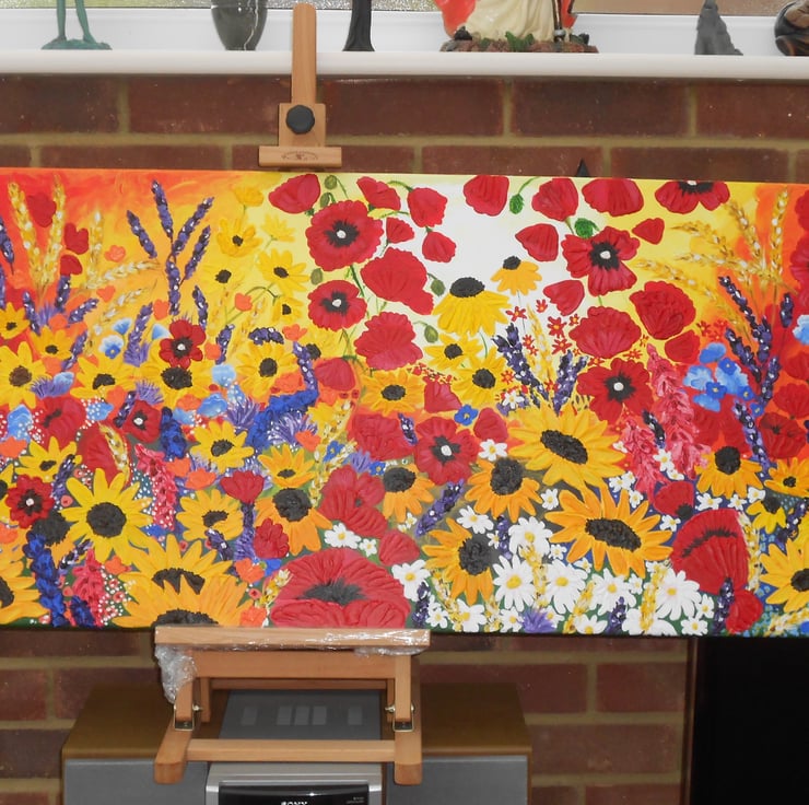 Large original textured acrylic landscape painting on canvas by me. Poppies, sunflowers, wild daisies, delphiniums in vibrant shades reflecting the early evening on a late summer day. Bright and beautiful for any room. Painting measures 100cm x 50cm and is unframed and light enough to hang on any wall.
