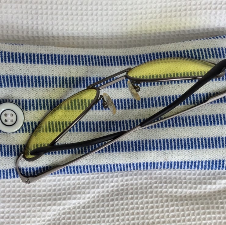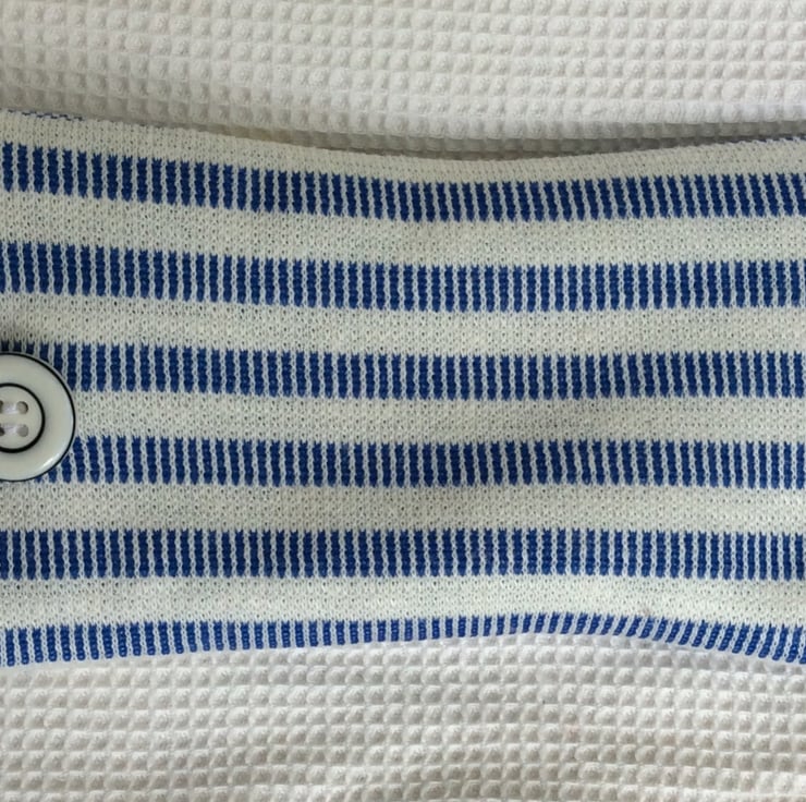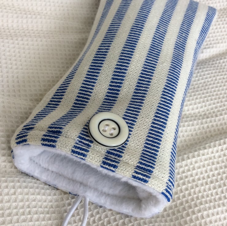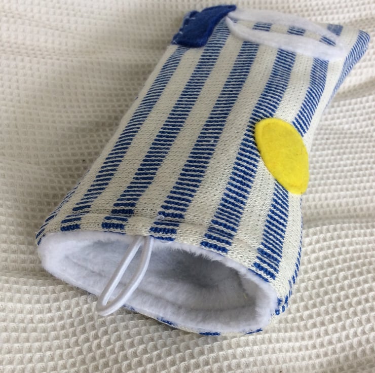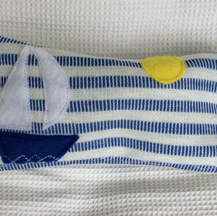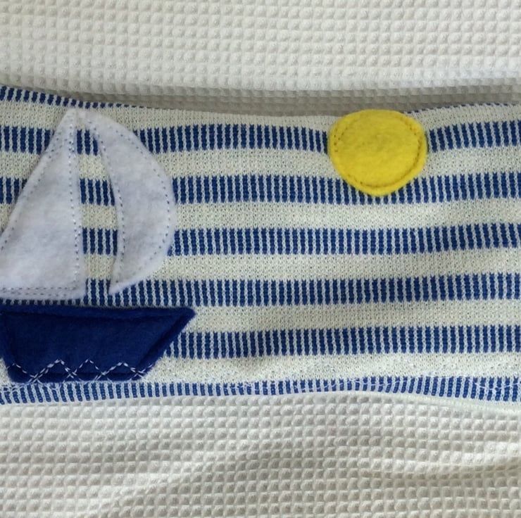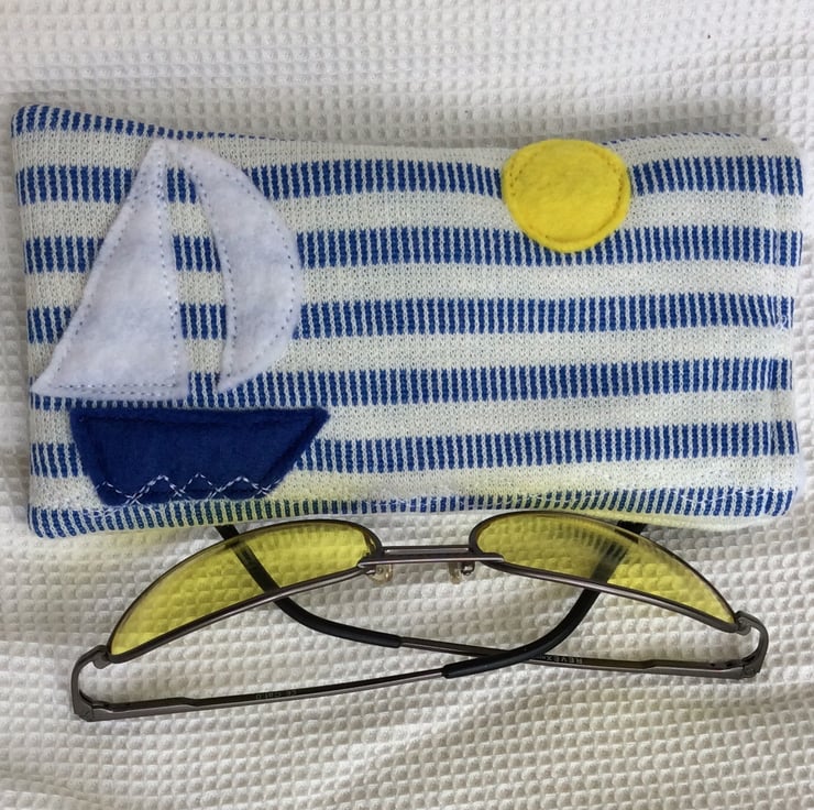 This summer holiday, seaside inspired sunglasses case has a machine appliquéd boat and sun motif on blue and white striped fabric. The case measures 15cm x 8cm, is lightly padded and lined in a soft, white velour. It has a blue and white button and white elastic loop closure to keep your glasses secure. ( Glasses for display only.)