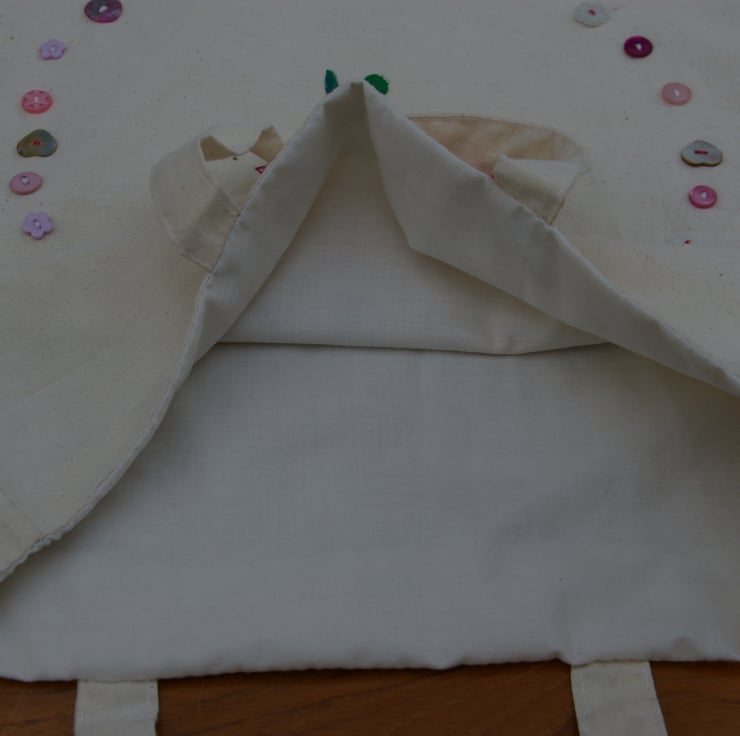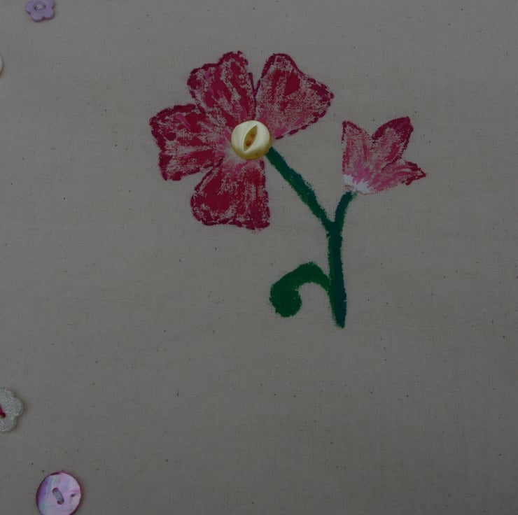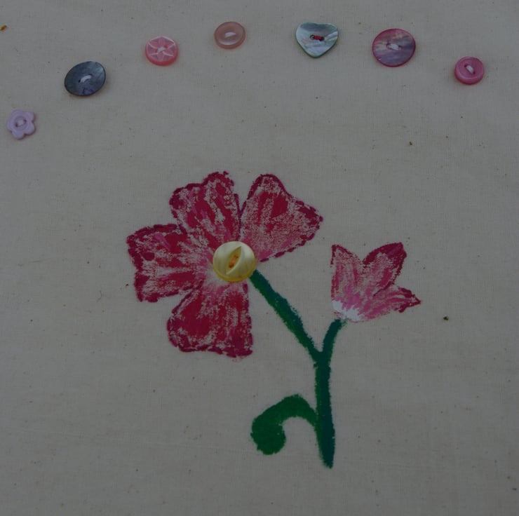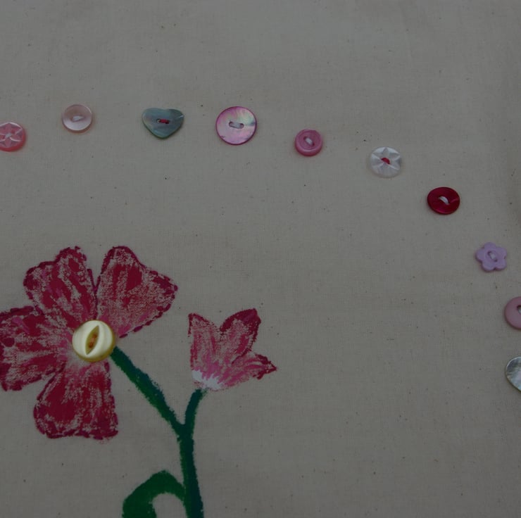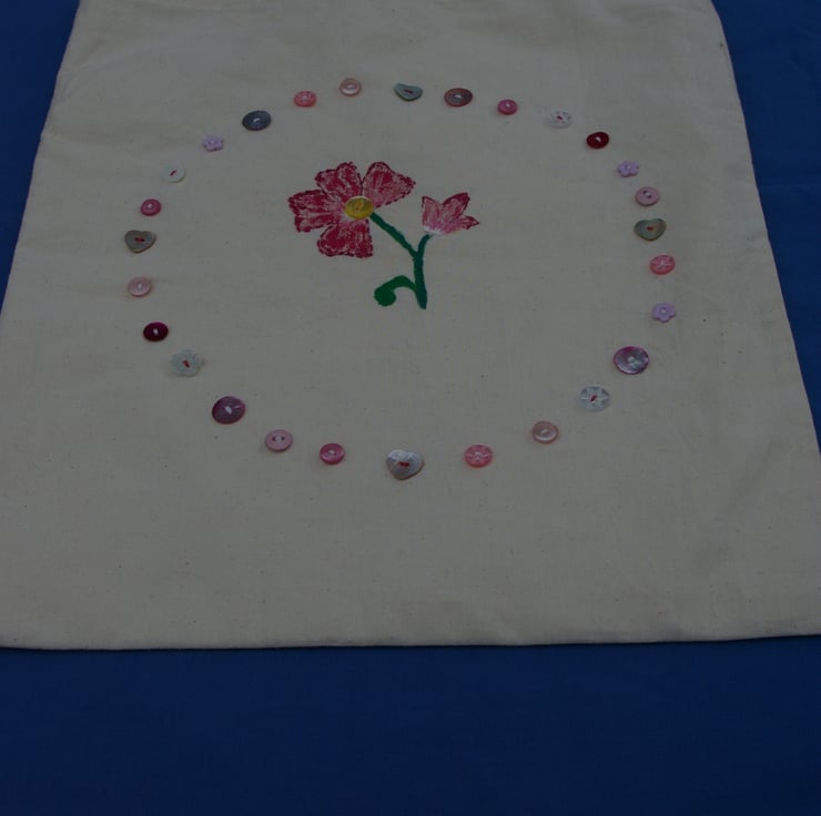 This tote bag is a, useful, pretty and strong accessory. The bag is made from 100% raw cotton. I have used an excellent quality fabric paint to create the flower design. Hand painted by myself, with the added touch of a few hand stitches in embroidery floss and sparkly blending threads. The flower is surrounded by a variety of pink and white buttons which I have hand sewn onto the bag. The design is on the front of the bag only leaving the reverse side blank. I have lined the bag with 100% white cotton.