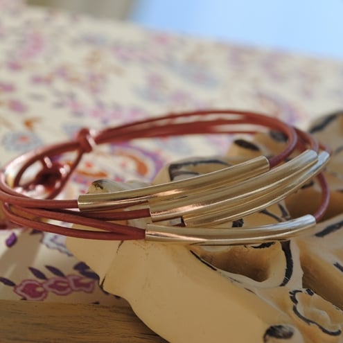 A friendship bracelet made with pink leather (faux) which wraps around the wrist and fastens with a mother of pearl / pink & brown & cream shade button. This wrap is completed with silver colour curve tubes. The bracelet is approx 7.5 to 8 inches in length.