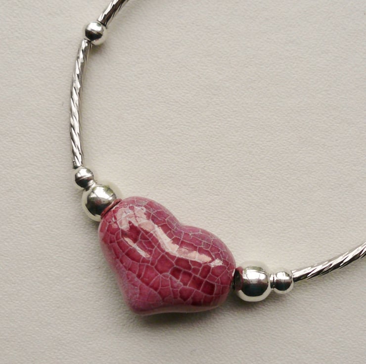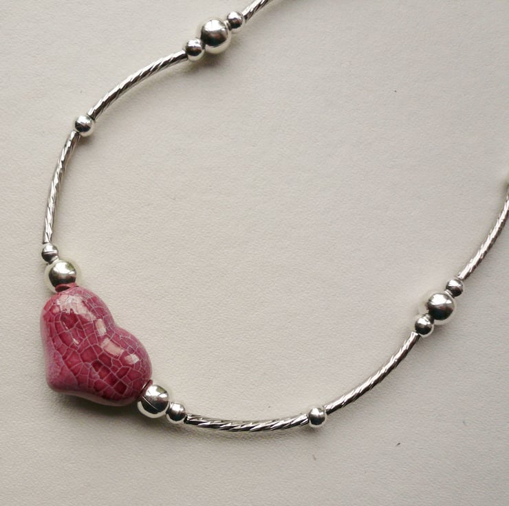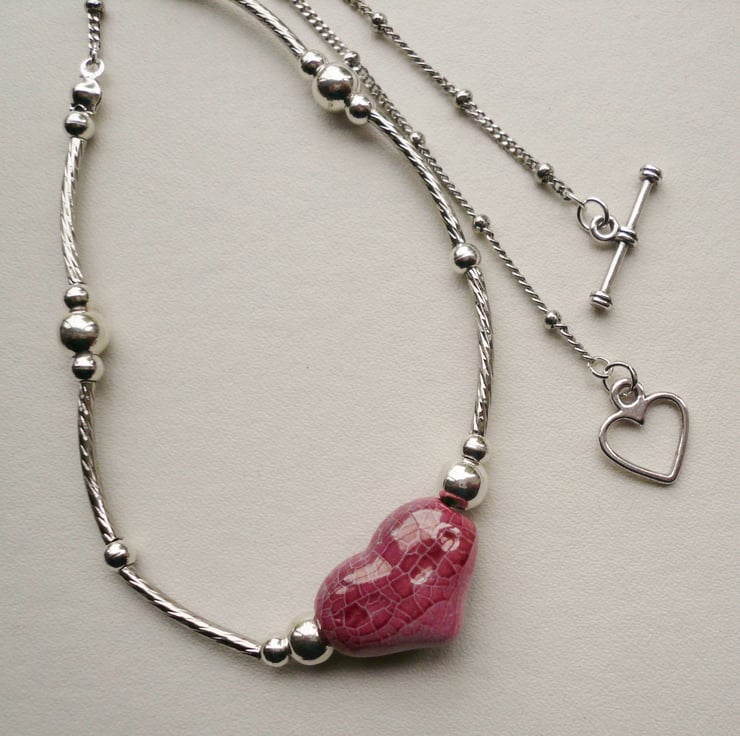 This delicate looking necklace is made up of a central 20mm wide strawberry pink crackle glazed ceramic heart with silver plated tube and round spacers and attached to ball chain and heart shaped toggle clasp. Total length incl clasp is approx 45cm.