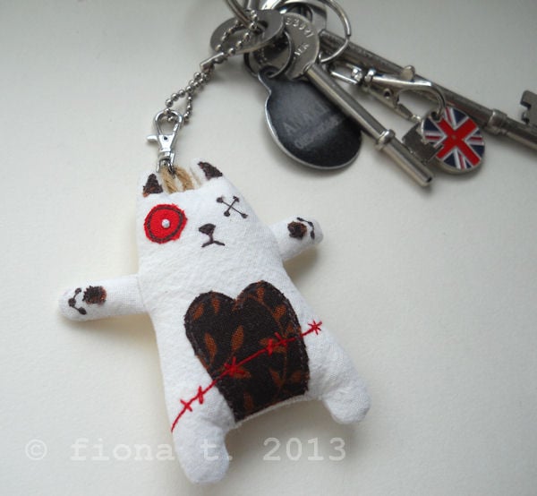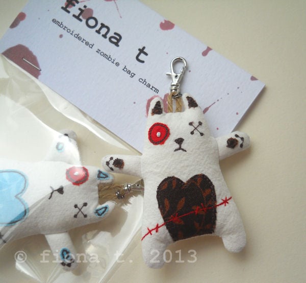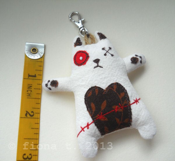 these deadly cute miniature fabric zombie cats measure about 8cm (3 inches) tall from the tips of their ears to the tips of their shuffling toes.