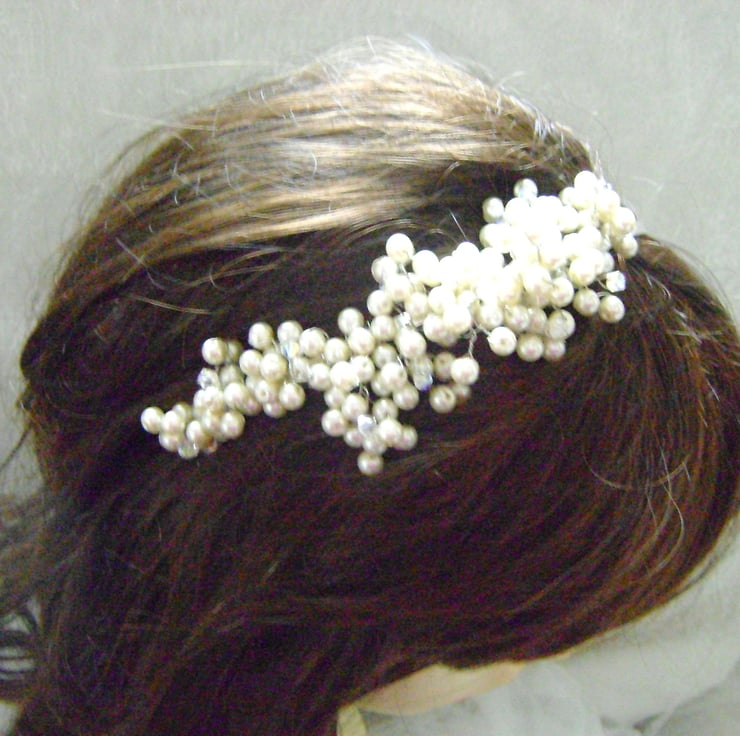 From my Bunch of Grapes Collection, I have created this tiara using the finest Swarovski Crystals & Ivory glass pearls in a cluster of grapes design which I have mounted on a silver plated tiara base, approx 5cm at widest point. This beauty is just gorgeous and the crystals dazzle like crazy. I am more than willing to create this tiara in a variety of colors and on a gold plated band if preferred - just message me with your requirements before payment.