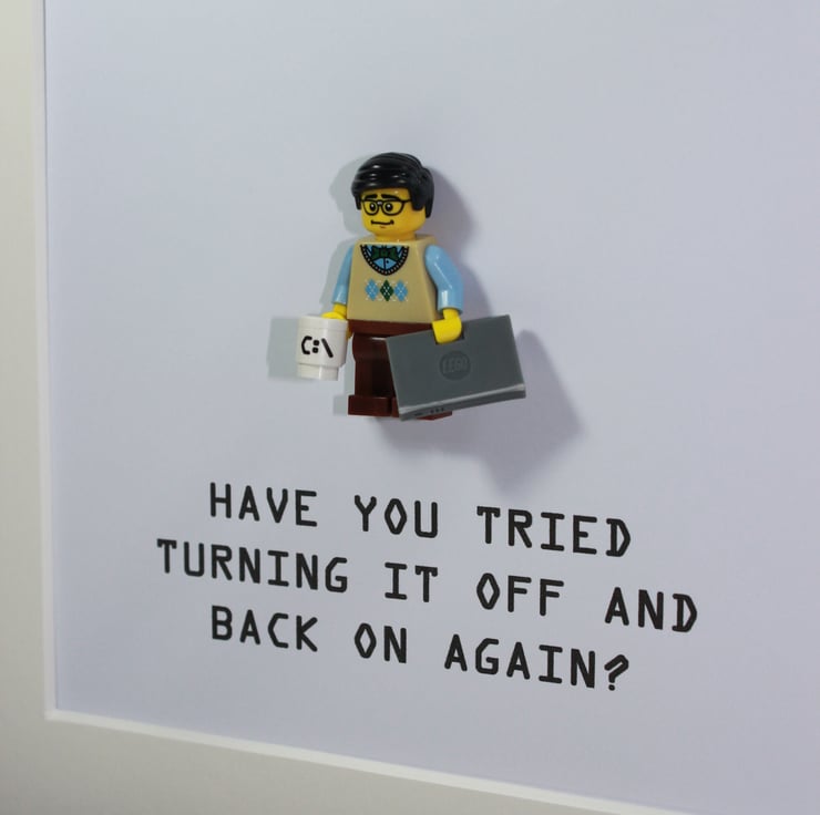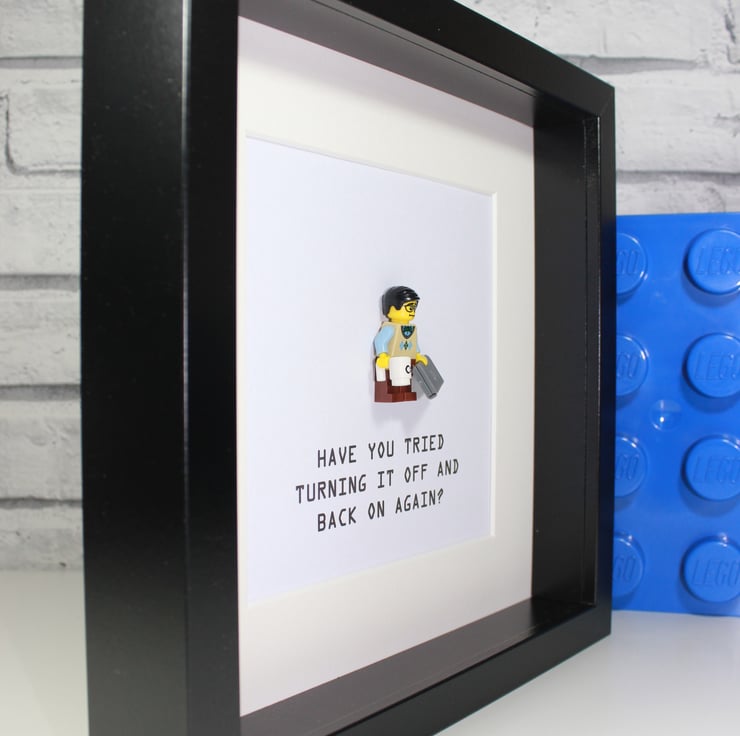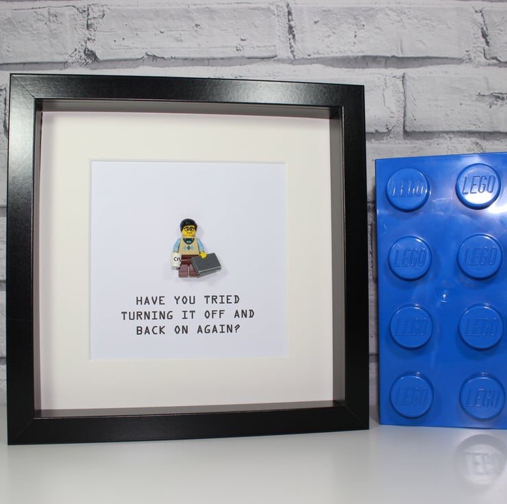 The deep box frame features a Computer Programmer minifigure, we refer to this little chap as our "IT Geek" - a lot of people associate him with the sitcom The IT Crowd... This wasn't our intention when we first made this frame but he does seem to be a perfect representation of the programme. He is mounted holding his laptop computer and a mug together with the immortal lines uttered by IT helplines "Have you tried turning it off and back on again?" - How many times have we heard those words?????!!!!!