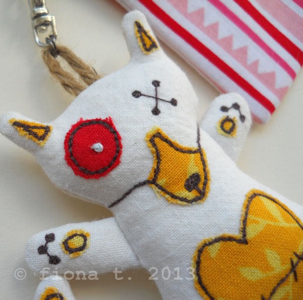 the yellow floral printed cotton fabrics are appliqued onto pre-washed calico, and the intricate details are drawn freehand with free machine (free motion) embroidery. its single eyeball is hand embroidered.