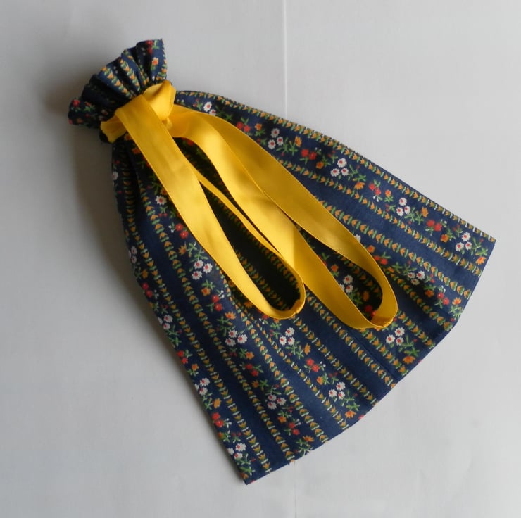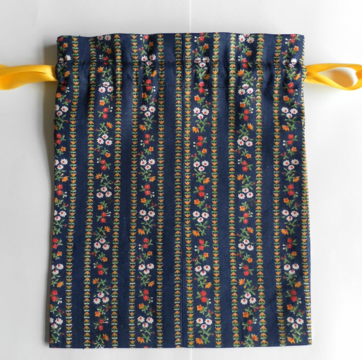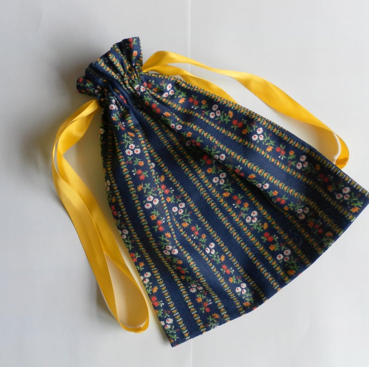 Simple, unlined, drawstring bag in a pretty cotton, floral fabric with a dark blue background. The bag is 23cm x 19cm and has a double yellow satin ribbon drawstring.