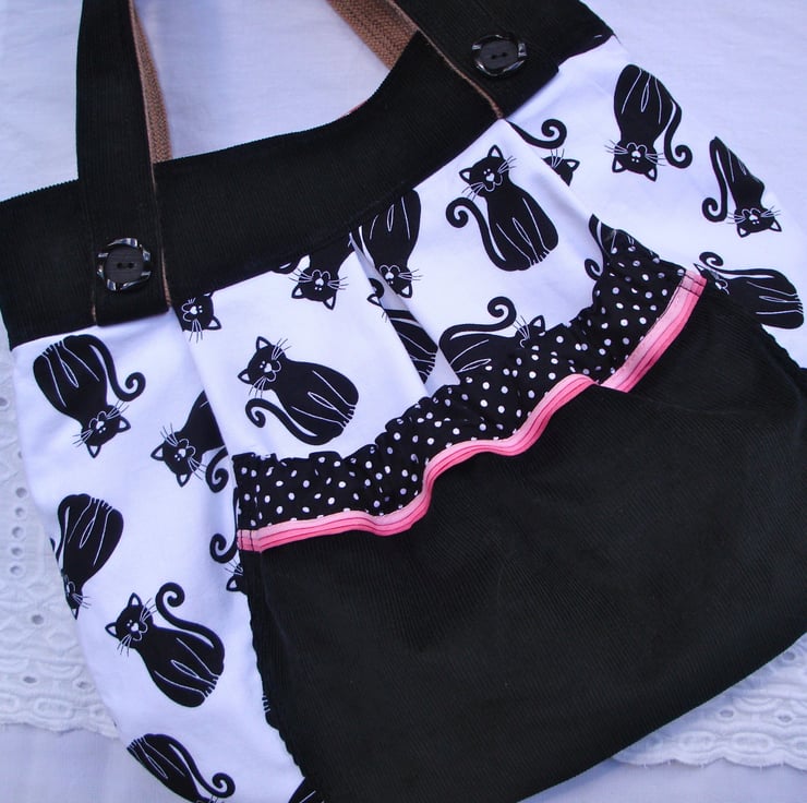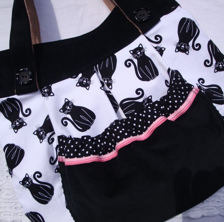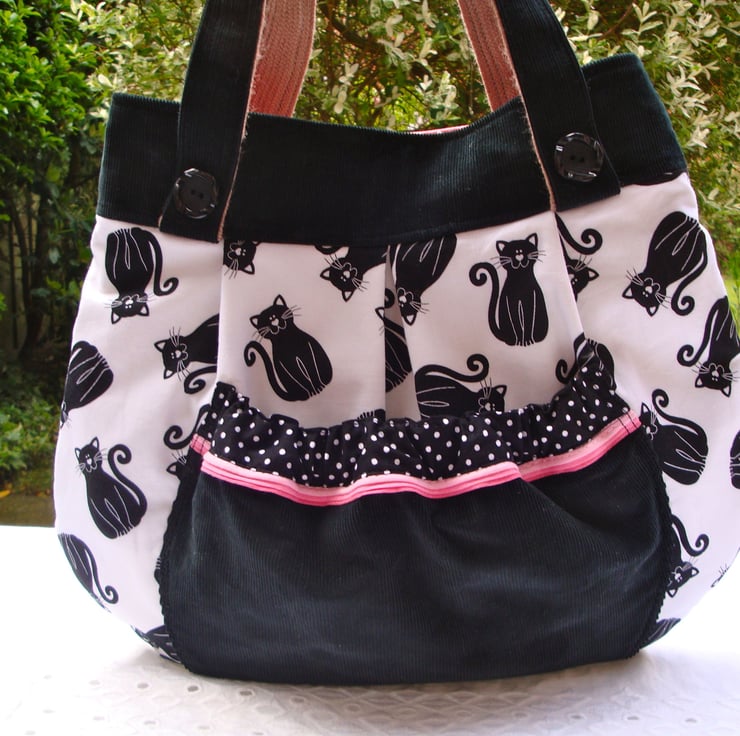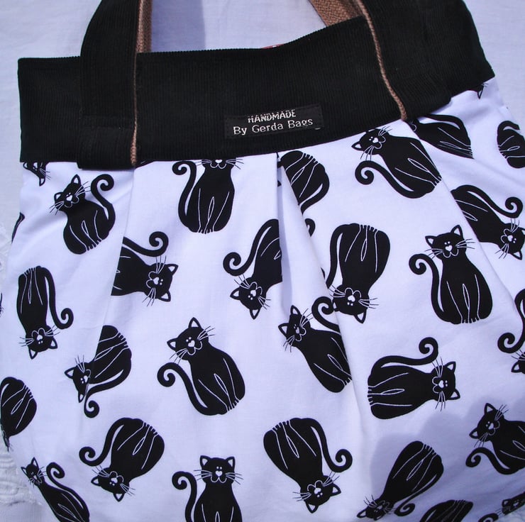 A lovely handbag , made in a 100% cotton fabric - featuring black cats on a white background.