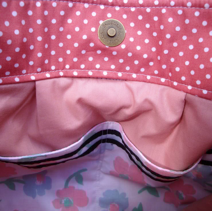 Bag is fully lined in a pale pink cotton fabric , and has 2 internal slip pockets.