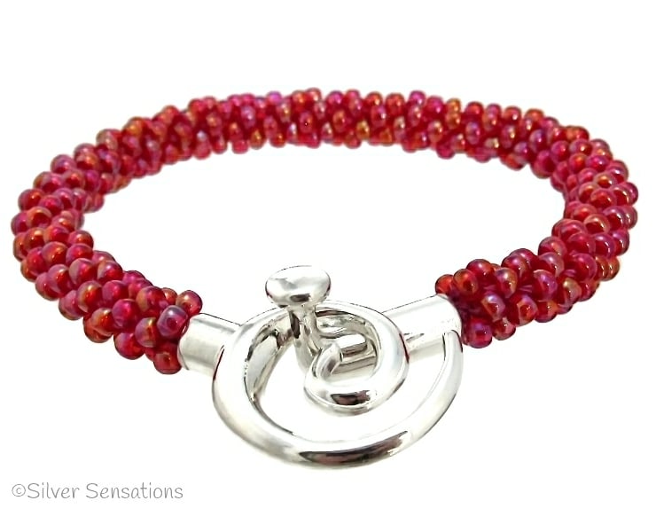 The clasp is silver plated and is in the design of a swirl and a toggle bar which slides around the swirl clasp creating a lovely feature for this bracelet.