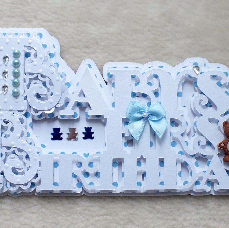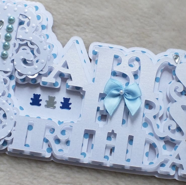 This gorgeous handmade 'Baby's First Birthday' word card is perfect for that special 1st birthday. The card base is made from premium quality centura card stock which has a pearlised finish. Layered with polka dot card, embossed and embellished with flowers and bow plus faux gems and pearls. The card includes the sentiment 'Happy 1st Birthday' inside, and is approx. DL in size.