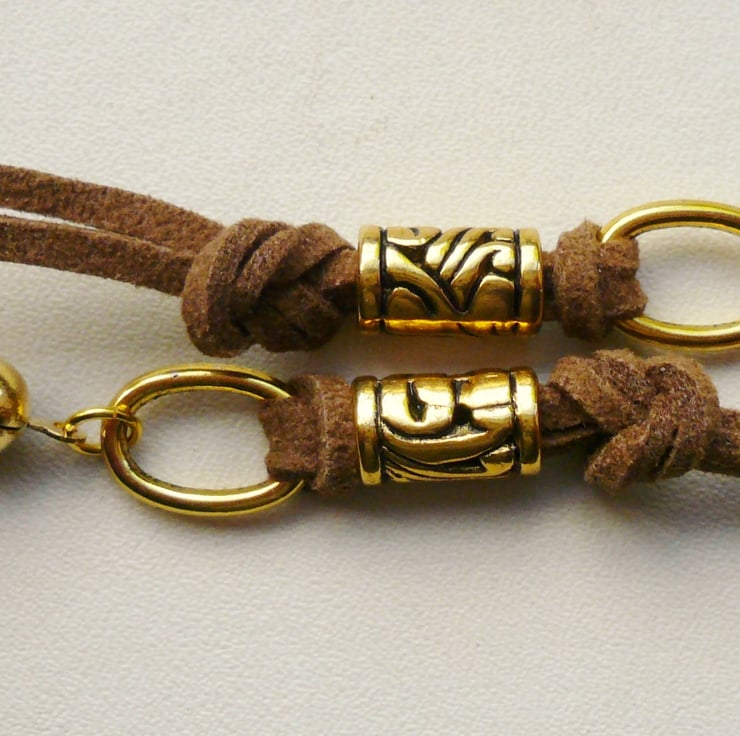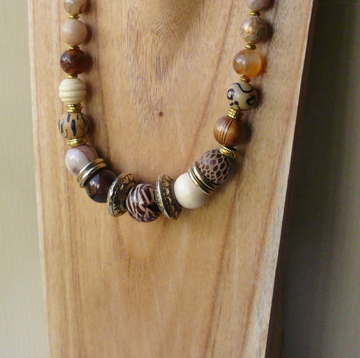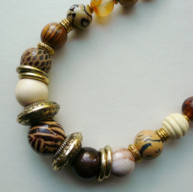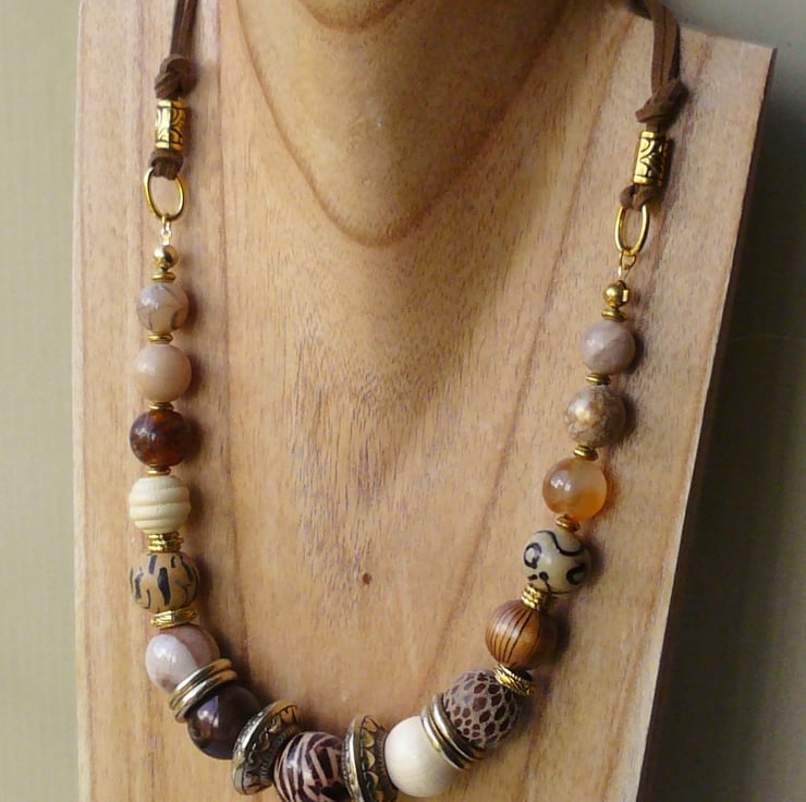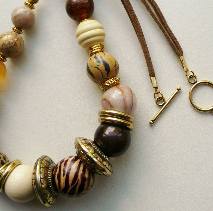 This necklace is made up of graduating size beads in tones of caramel and cream in the form of glass, stone, wood, clay polymer and resin. Also includes semi precious sunstone and carnelian. Largest central animal print wooden bead measures 20mm. Spacer rings, rondelles, tubes and connectors are a mixture of metalised acrylic and gold plate. All attached to twin lengths of 3mm thick light tan faux suede cord with gold plated toggle clasp. Total length incl clasp is approx 53cm.
