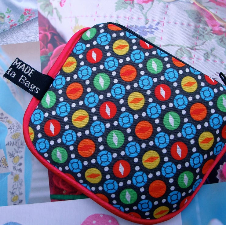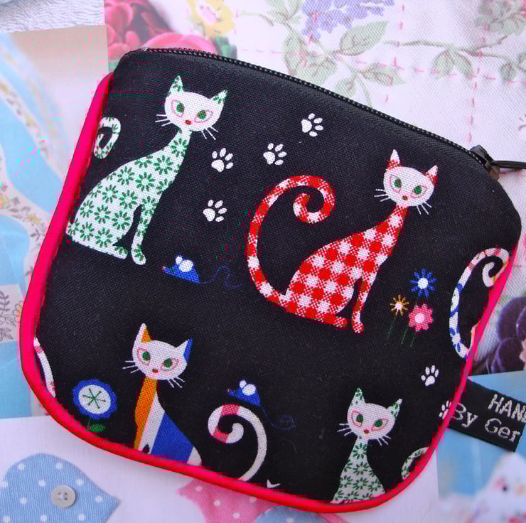 Cotton  Zipper Coin Purse - multicoloured cats - piping .