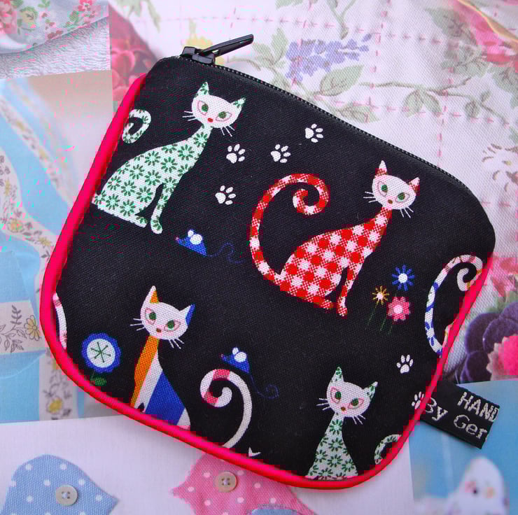 Cotton Zipper Coin Purse - multicoloured cats - piping .