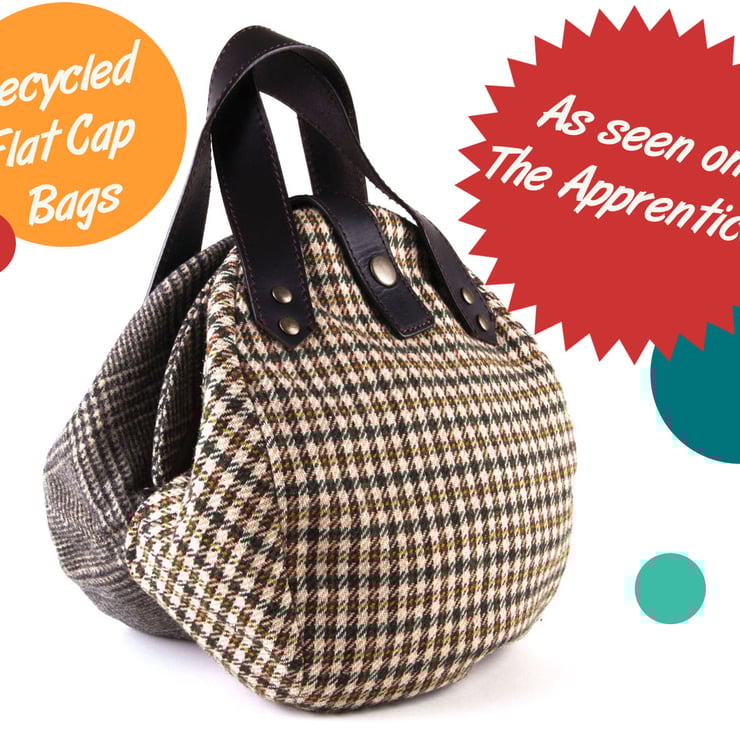As seen on The Apprentice 2014 and described by The Sunday Telegraph as "the most stylish gift around" - this unique recycled handbag is created from two carefully chosen vintage tweed flat caps, handmade with beautiful leather handles and snap fastening.