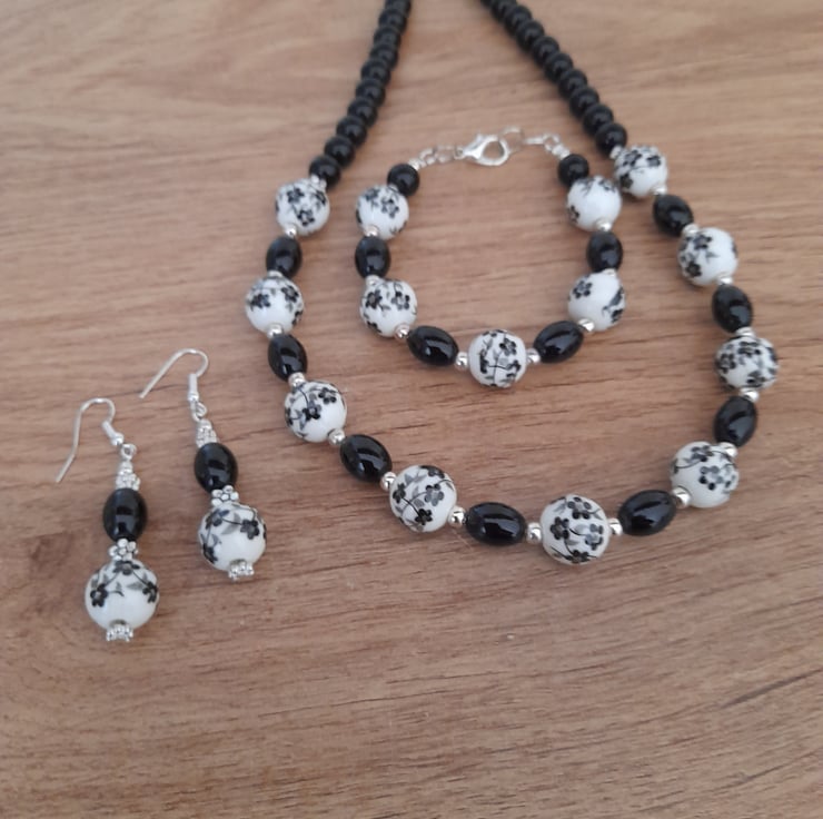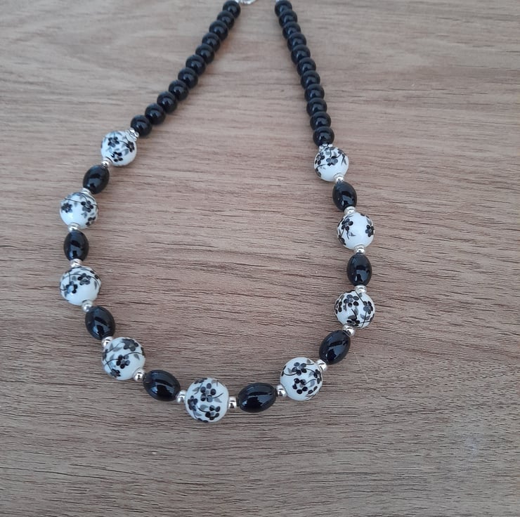THE NECKLACE HAS BEEN MADE WITH 12MM ROUND PORCELAIN BEADS IN BLACK AND WHITE FLORAL DESIGN ALONG WITH OVAL GLASS BLACK BEADS AND 8MM GLASS ROUND BEADS IN BLACK, SMALL SILVER PLATED ROUND SPACER BEADS AND FINISHED WITH SILVER PLATED LOBSTER CLASP AND FINDINGS.