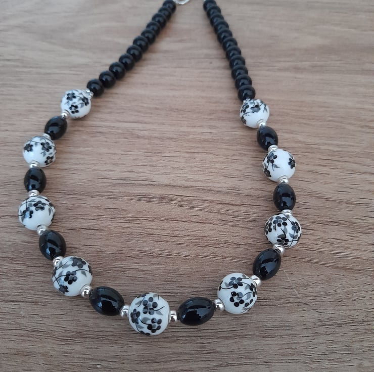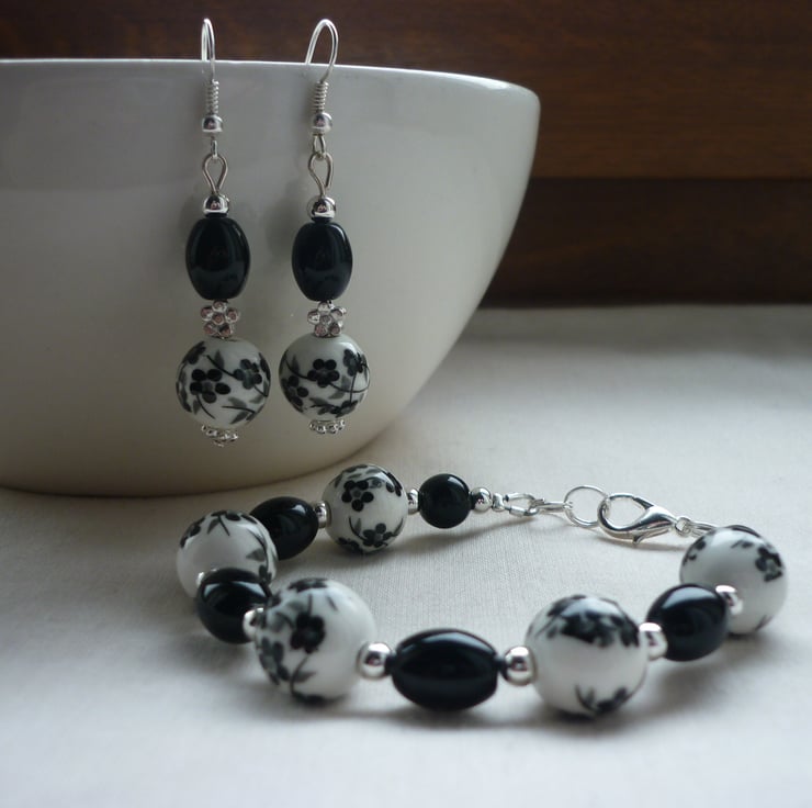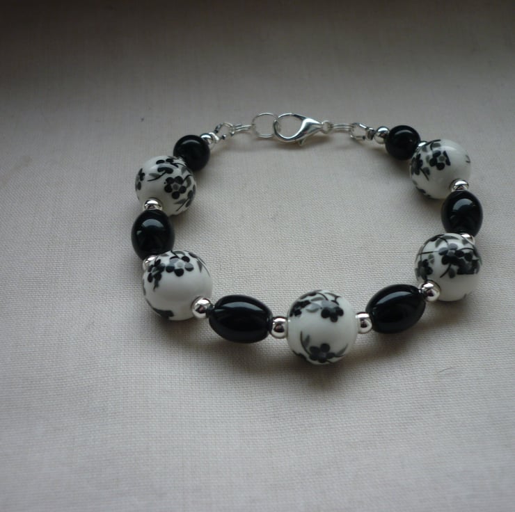 THE BRACELET HAS BEEN MADE WITH 12MM PORCELAIN BEADS IN BLACK AND WHITE FLORAL DESIGN ALONG WITH 12MM BLACK GLASS BEADS, SMALL SILVER PLATED SPACER BEADS AND FINISHED WITH SILVER PLATED LOBSTER CLASP AND FINDINGS.