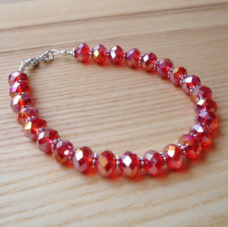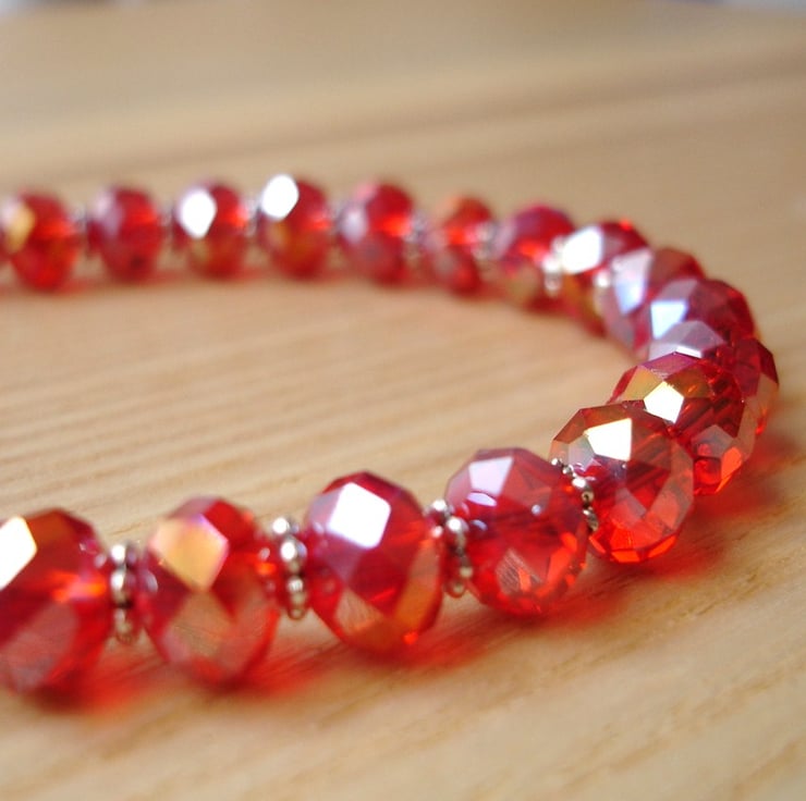 This gorgeous bracelet features some lovely bright red facetted glass crystal beads punctuated with teeny tibetan silver beads. The beads are strung using tiger tail nylon coated wire, finished off with a silver plated lobster clasp.