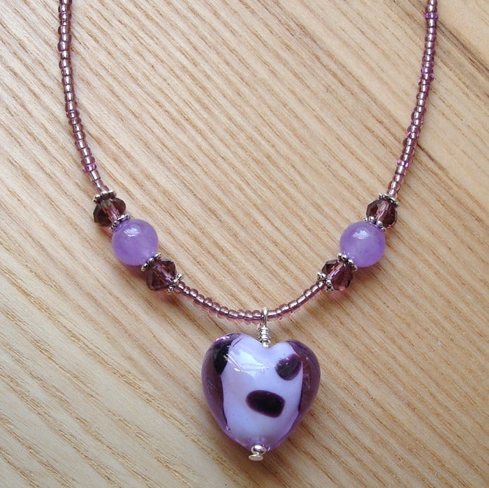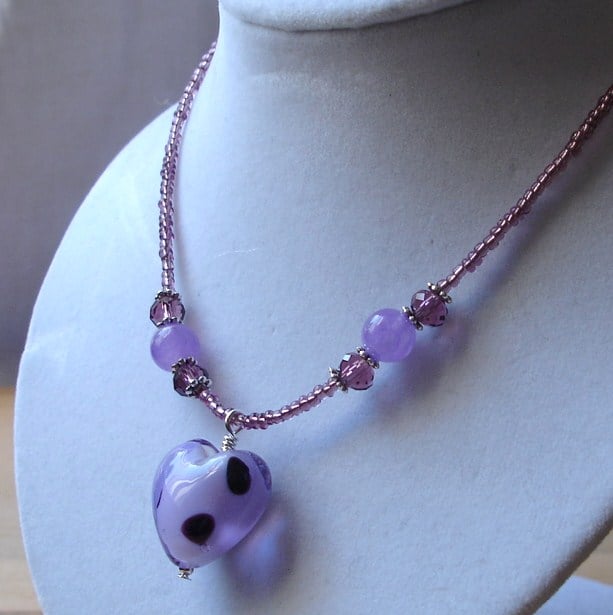 This lovely pendant necklace features a cute purple glass heart. It is finished with an 18 inch long strand of glass seed beads with purple glass beads and tibetan silver beads. Fabulously kitsch and one of a kind!