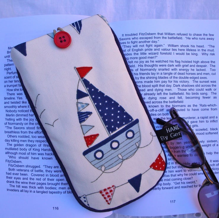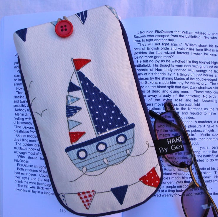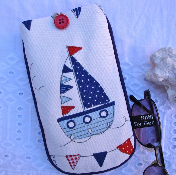 Front of this lovely glasses case - has been made in a cotton fabric - featuring a boat - and bunting - on a white/cream background.
