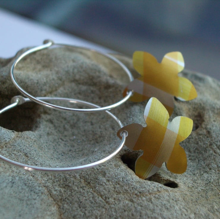 The flowers measure 15mm in diameter and they dangle from sterling silver hoops which are 25mm in diameter. If you would prefer these earrings on fish hooks, please ask.