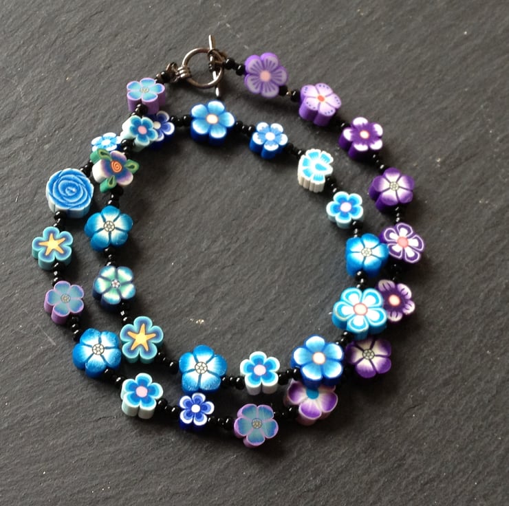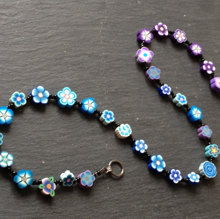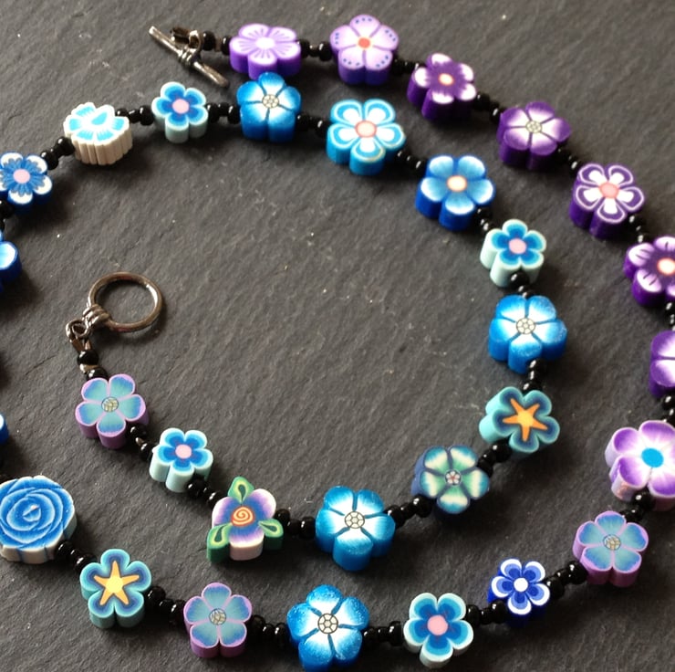 As discussed, an 18 inch variation on the Flower Power Rainbow Garland Necklace in shades of mainly blues.