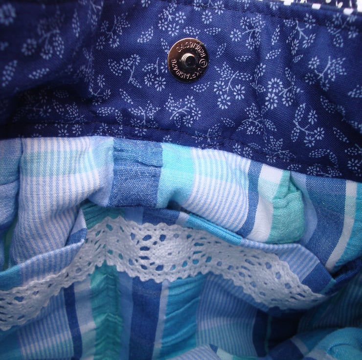 Straps has been made in denim , and lined in a patchwork effect cotton fabric.