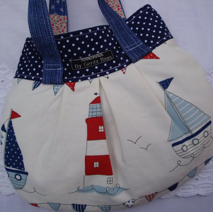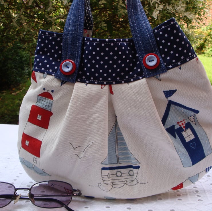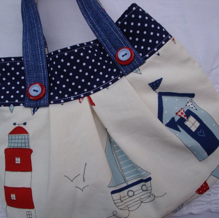 Bag has been made to my own design , and is made in a cotton fabric - featuring - boats - beach huts - bunting , on a creamy/white background .