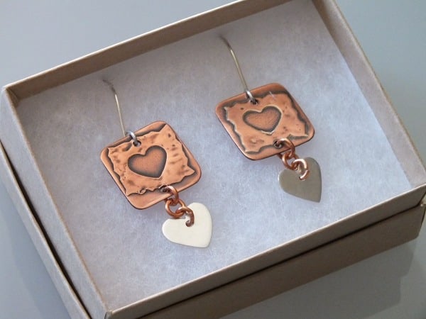 Delightful drop earrings made from antique-finish copper and fine silver. The earring wires are handmade from sterling silver.