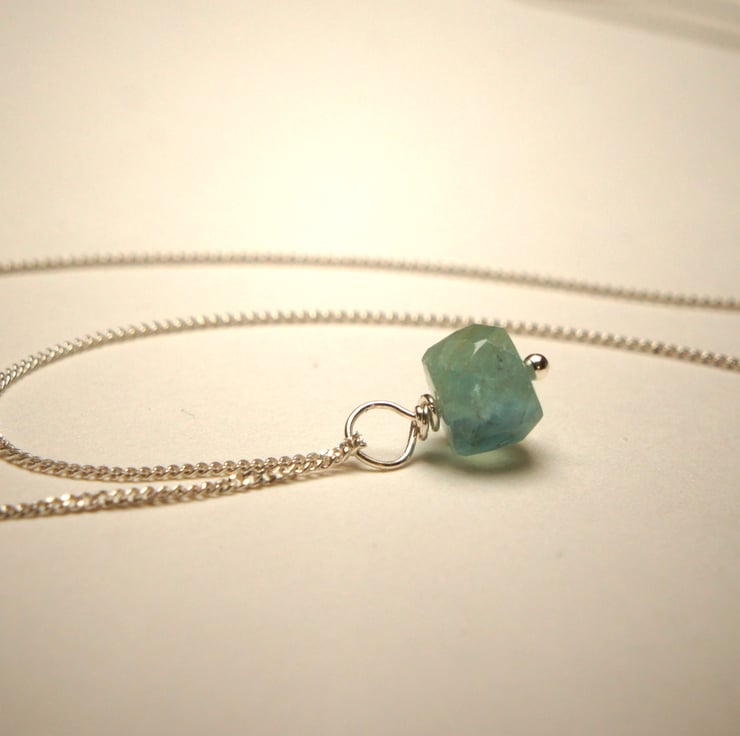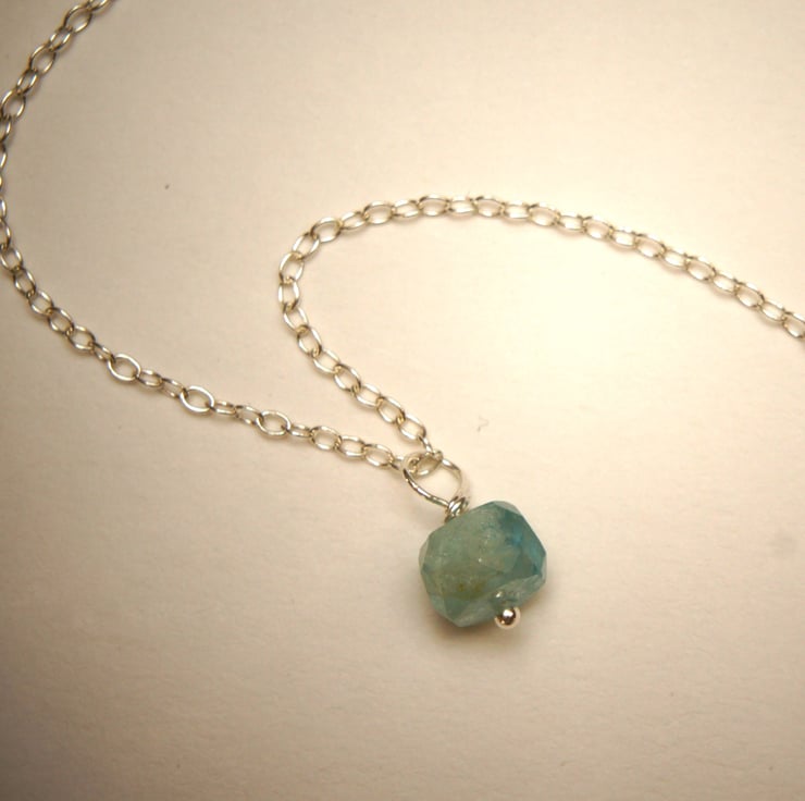 A single cloudy sea green aquamarine threaded with sterling silver and hung on a sterling silver chain.