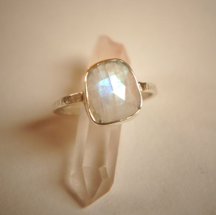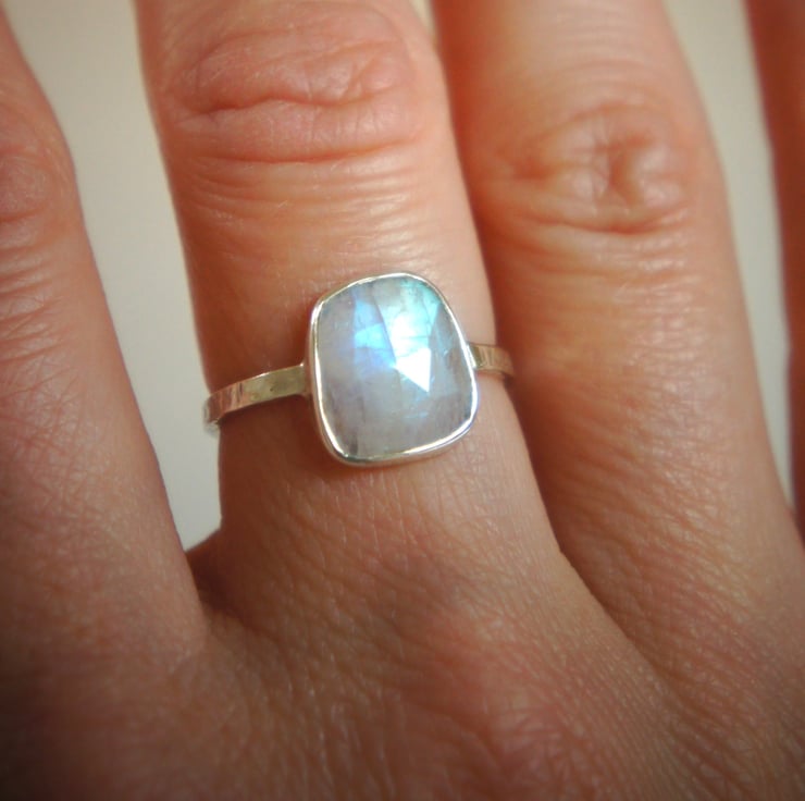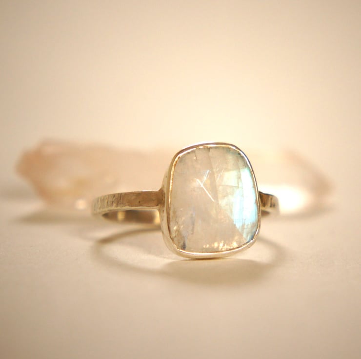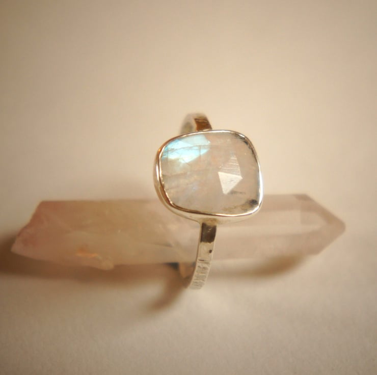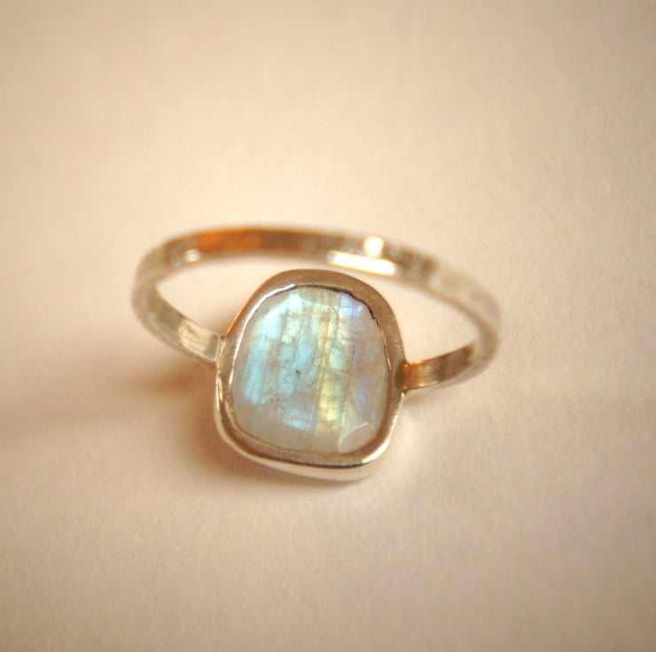 A delicate glowing rainbow moonstone, this gorgeous gemstone is set in sterling silver.