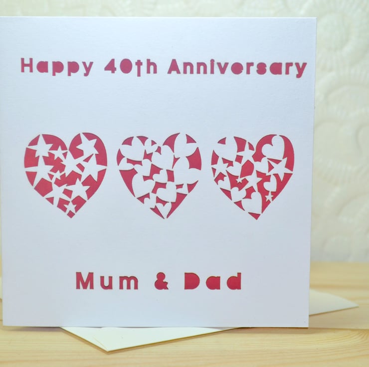 This laser cut personalised anniversary card comes complete with 3 intricate hearts.