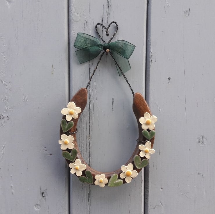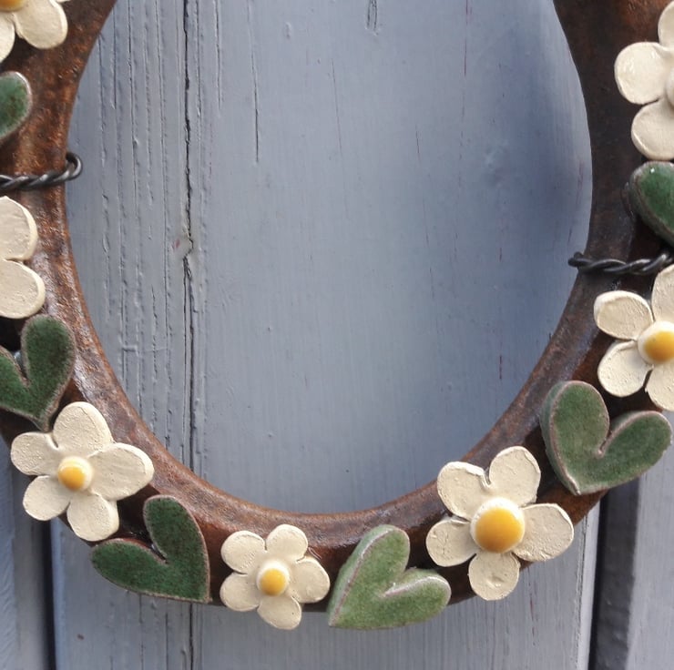 Every Horseshoe has been worn ....some by our own Horses, (see picture of Ruby and Rupert ) I hand make each pottery heart and flower, and attach to the shoe..the wire hanger is made from recycled wire.