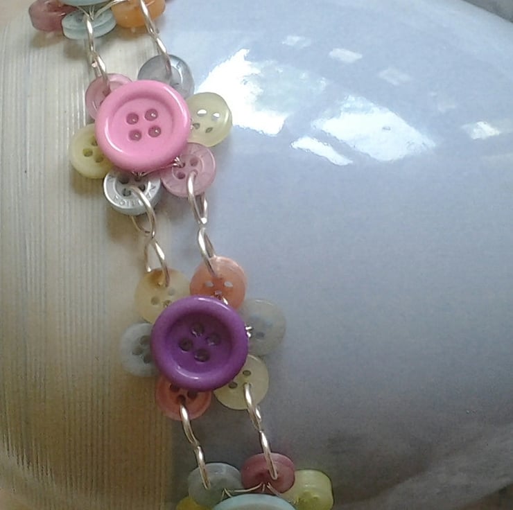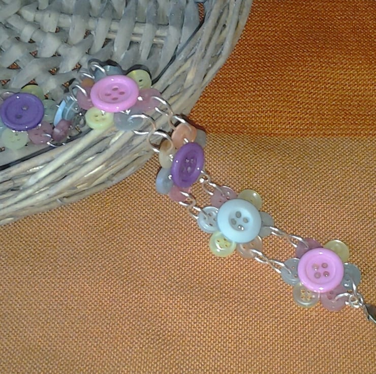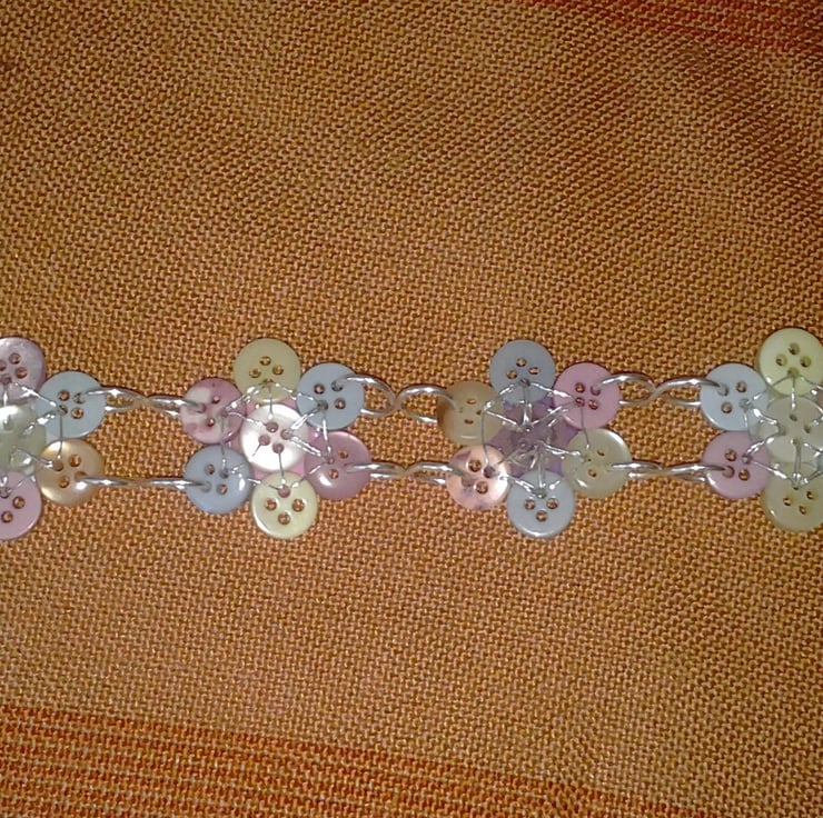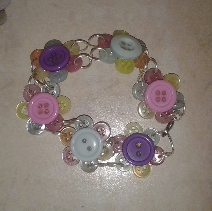 Each flower has been made up of 8 individual buttons, 7 small with 1 larger button in the center. The flowers have then been linked together using silver plated wire in a figure of 8 design and has a lobster claw clasp fastening.