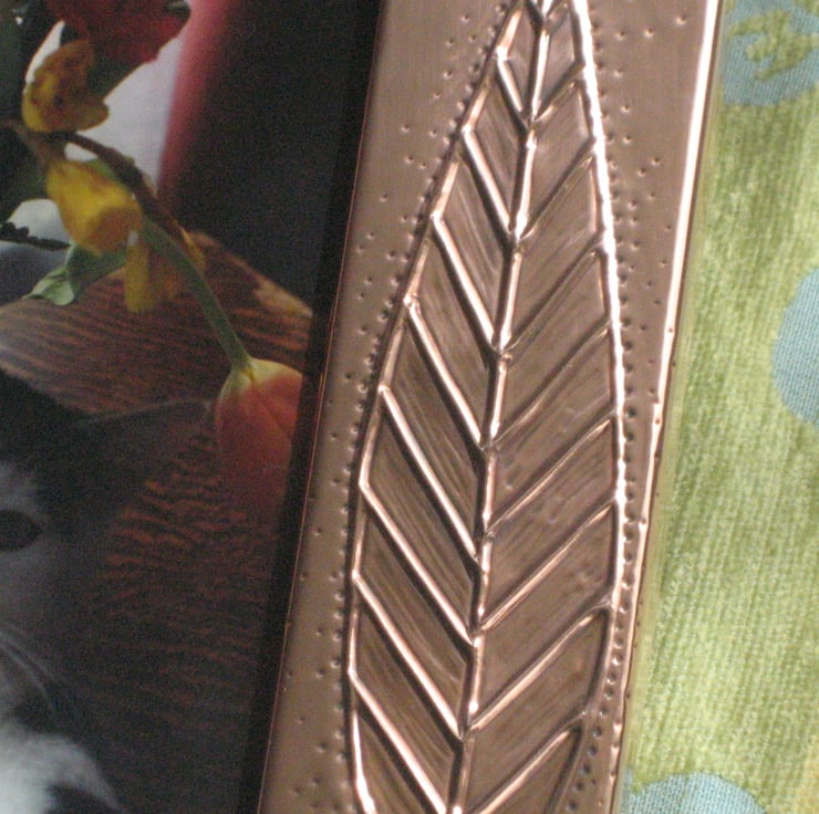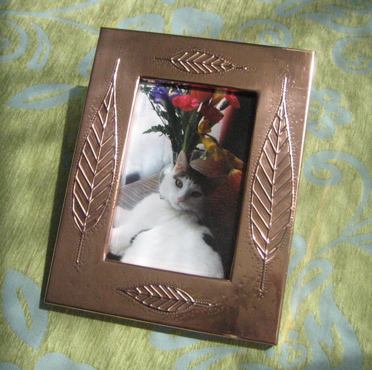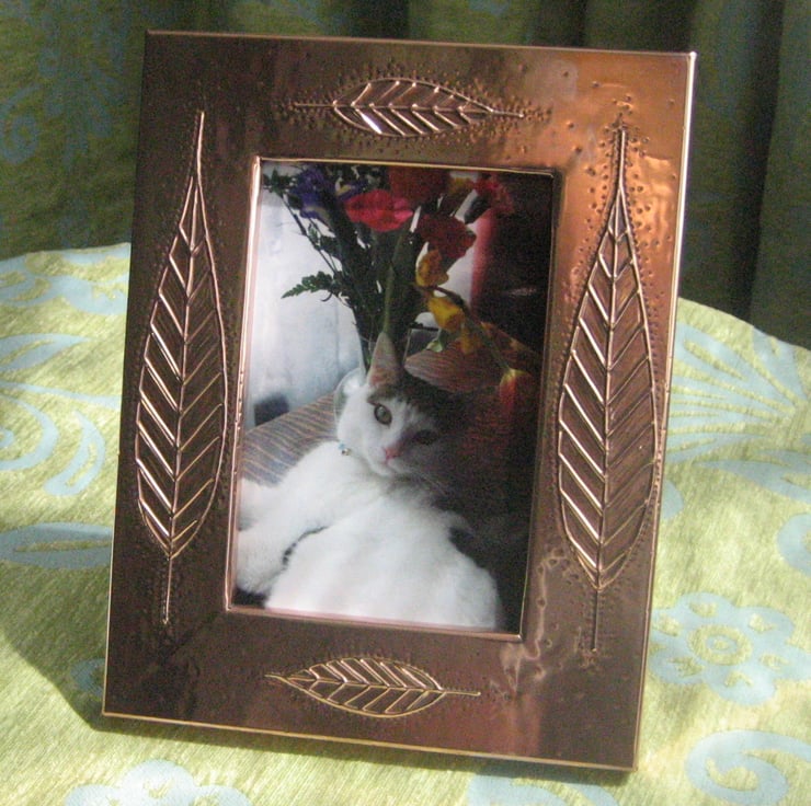 This frame has been handmade using the repousse method popular with the Arts and Crafts movement . It measures 173 x 220mm overall and will take a 4 x 6 inch photograph. The reverse, which is covered in blue velour, has a stand. This would be a great gift for a 7th Wedding Anniversary, Birthday, Fathers Day, Mothers Day, Graduation or any other special occasion.