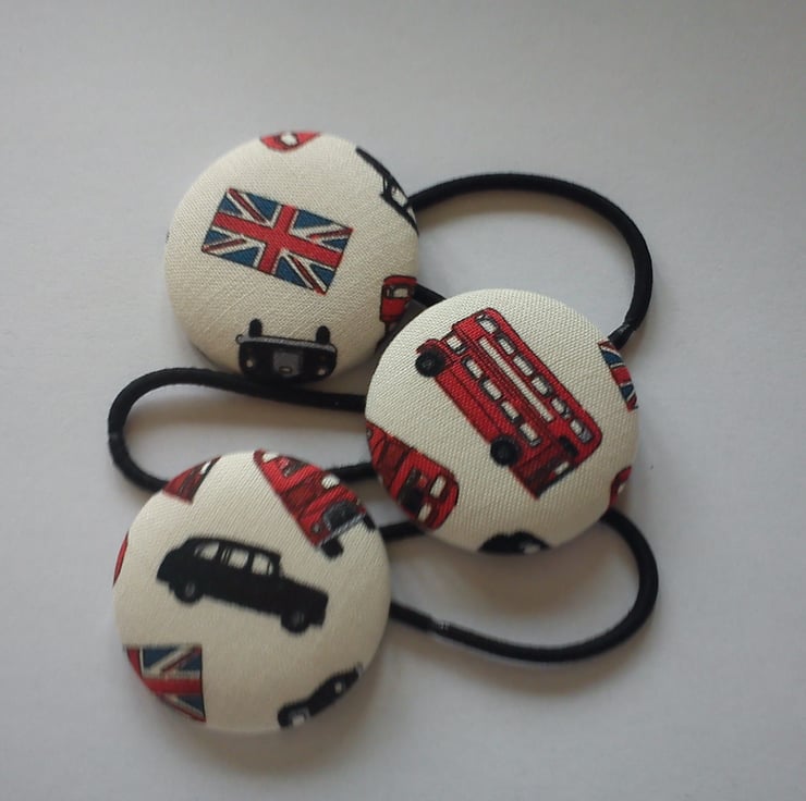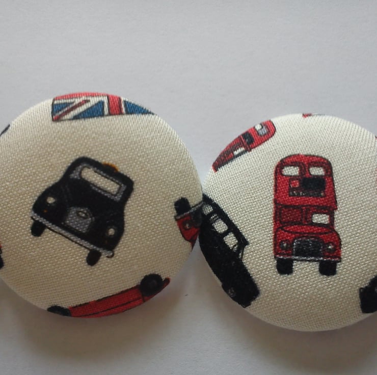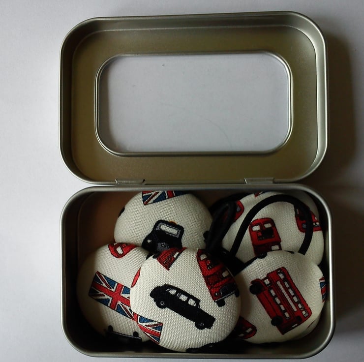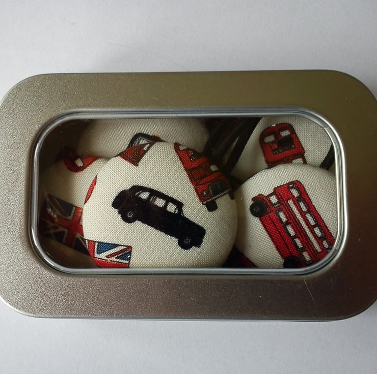 A set of 5 fabric covered button bobbles featuring iconic London images, of the union jack, black cabs and red buses. Rule britannia! Each button measured 45mm across and had a snag free black bobble attached. Great for making a statement! Supplied in a metal gift tin.