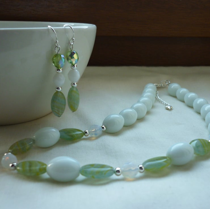THE EARRINGS HAVE BEEN MADE WITH OVAL GLASS BEADS IN LEMON AND LIME WITH A PATTERN WITHIN THE BEAD ALONG WITH FACETED ROUNS WHITE OPAQUE BEADS, FACETED ROUND AB GREEN GLASS BEADS, SILVER PLATED SPACER BEADS AND FINISHED WITH STERLING SILVER 925 EAR WIRES.