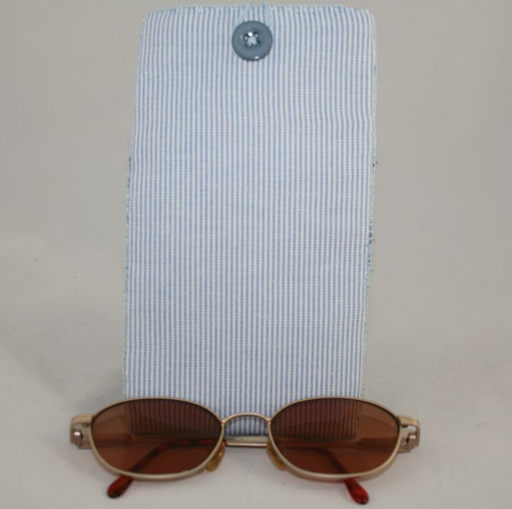The top edge of the case is finished in blanket stitch, using a pale blue crochet cotton. The case closes with a crocheted loop, also in the pale blue crochet cotton, over a vintage blue button. The case is lined with a blue and white striped fabric.