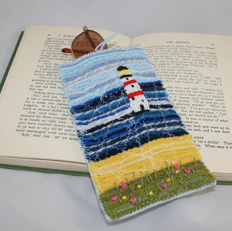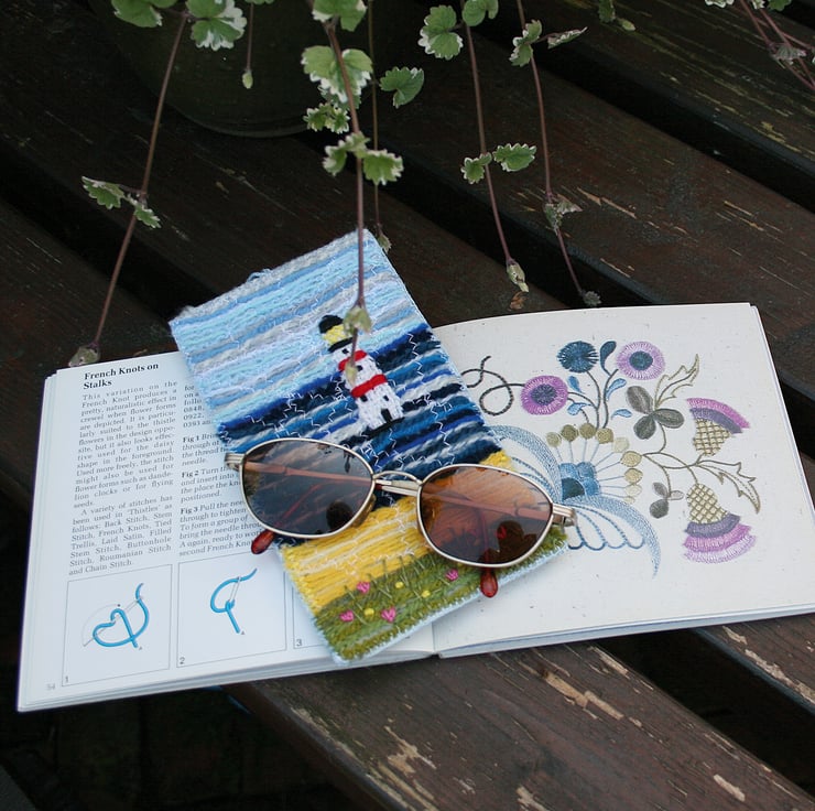 This glasses case features a sunny, coastal scene, of a lighthouse at sea, embroidered onto a felted background.
