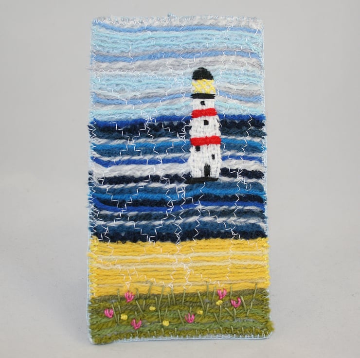 A wide variety of fancy yarns have been 'felted' to a commercial felt background by the use of an embellisher machine. The lighthouse, sea pinks, yellow poppies and grasses have been added by embroidery. Machine stitching in a 'shallow zig zag' criss-crosses the background to stabilise the felting.