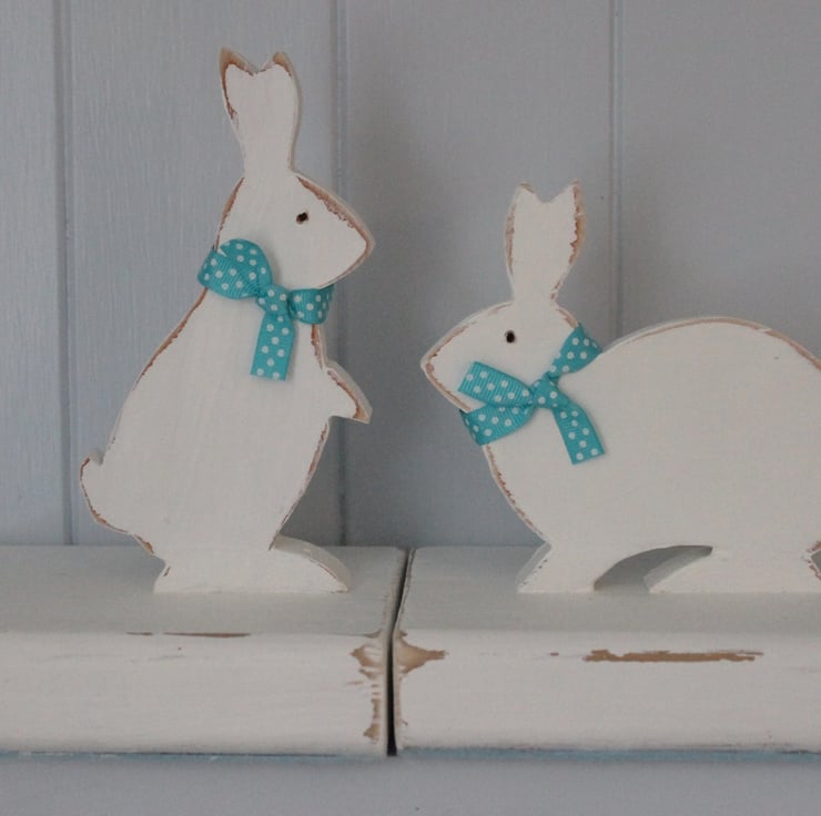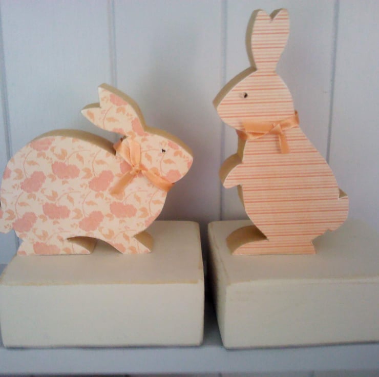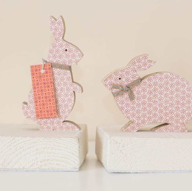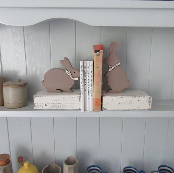 We have now made a range of Bunny Bookends, and they look lovely in the nursery or playroom. All handmade using reclaimed materials where possible. They are cut out individually using our own designs and sanded and distressed if painted. The rabbits can be decoupaged with various pattern and coloured paper or painted in a colour of your choice. Please contact us for custom orders if you are ordering for a baby's present.