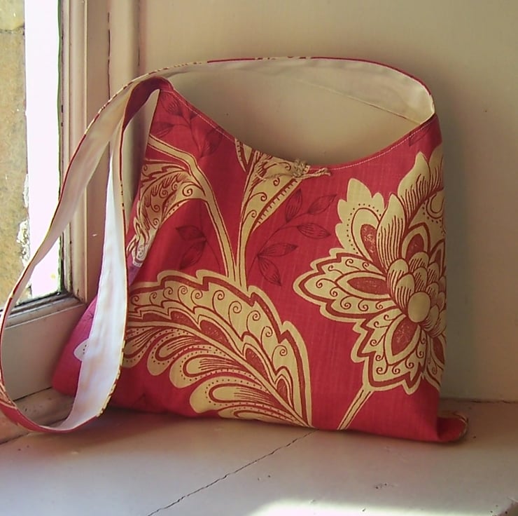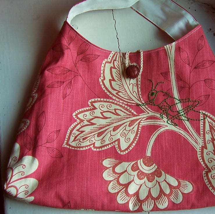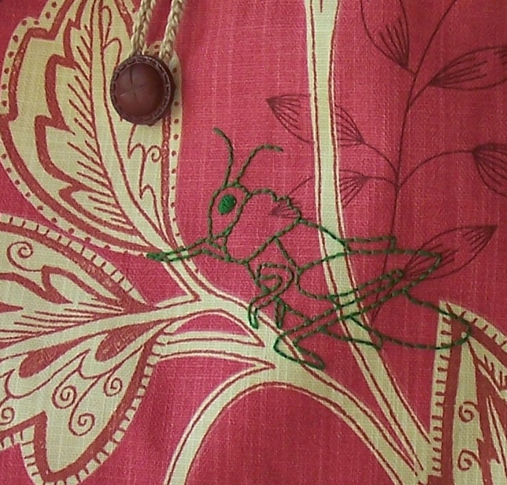 Non adjustable strap, cross body style. Pinky brown furnishing fabric with a cream and terracotta print. Hand embroidered with an emerald green grasshopper (my original design). Bag fastens with a crochet chain loop and a vintage plastic button.