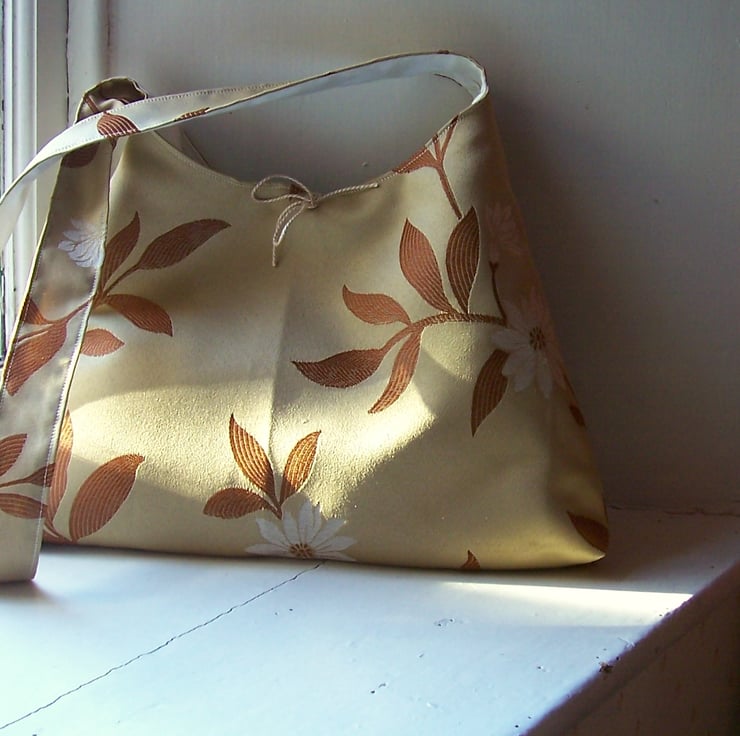 Non adjustable strap, cross body style. Tawny brown cotton furnishing fabric with white flower and rust foliage print. Machine embroidered with one beetle (my own design) in dark brown thread. Bag fastens with a crochet chain loop and a mother of pearl button.