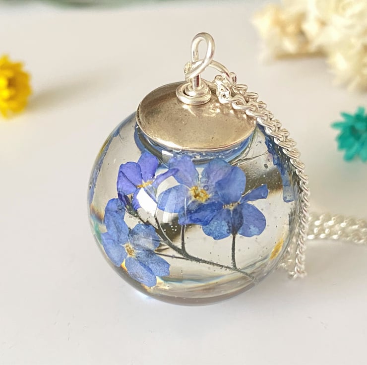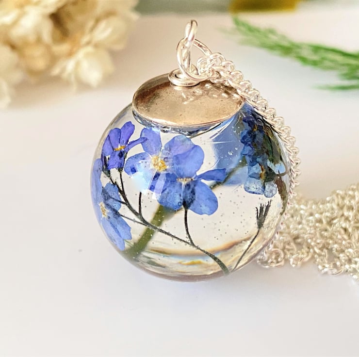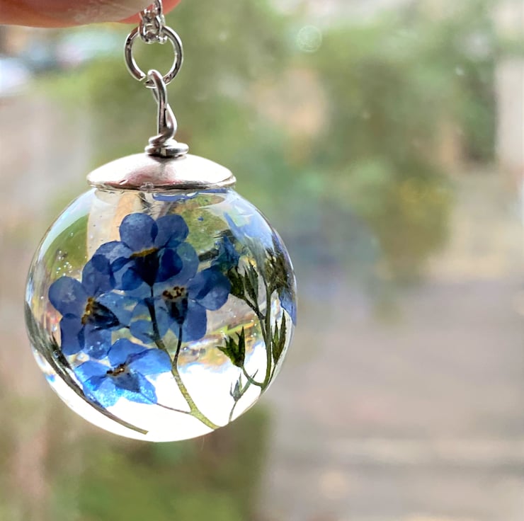 Description: I added these pretty forget me nots to UV resistant, non toxic eco friendly clear resin, the effect is mezmerising magnified under the crystal clear resin dome. This large orb measures around 25mm. I have capped with a silver cap and hung on an extra long 30 silver plated chain. If you prefer shorter chain message me..