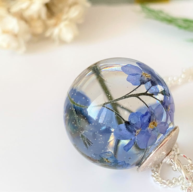 Real forget me nots encapsulated forever in a crystal clear resin ball, lovingly hand made by myself: