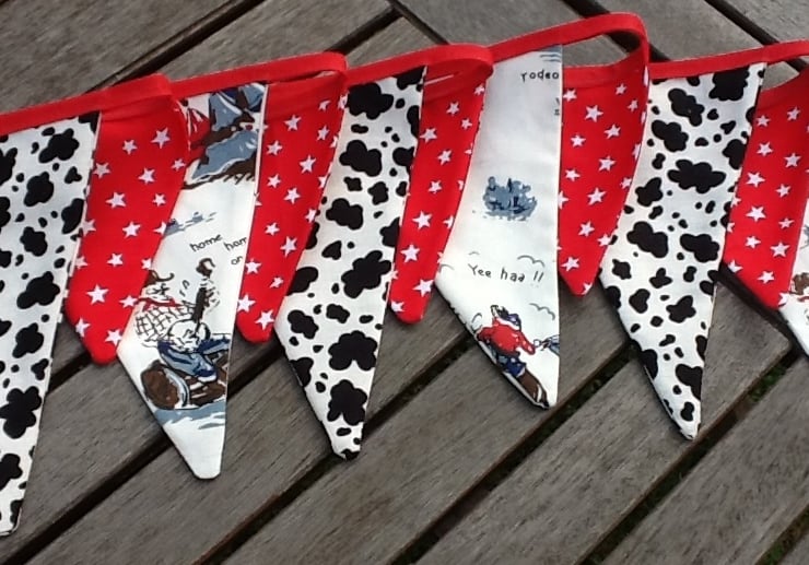 Home on the range, with this vintage cowboy fabric, with stars and cow prints. Each of the cowboy fabrics is unique as the fabric features cactus, tepees, cowboys, Native American Indians. It has 11 flags (can be customised to longer lengths if you want) and two sizes, it measures just under 6ft of flags with an extra 10 inches at each end for ties.