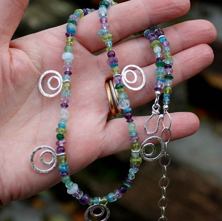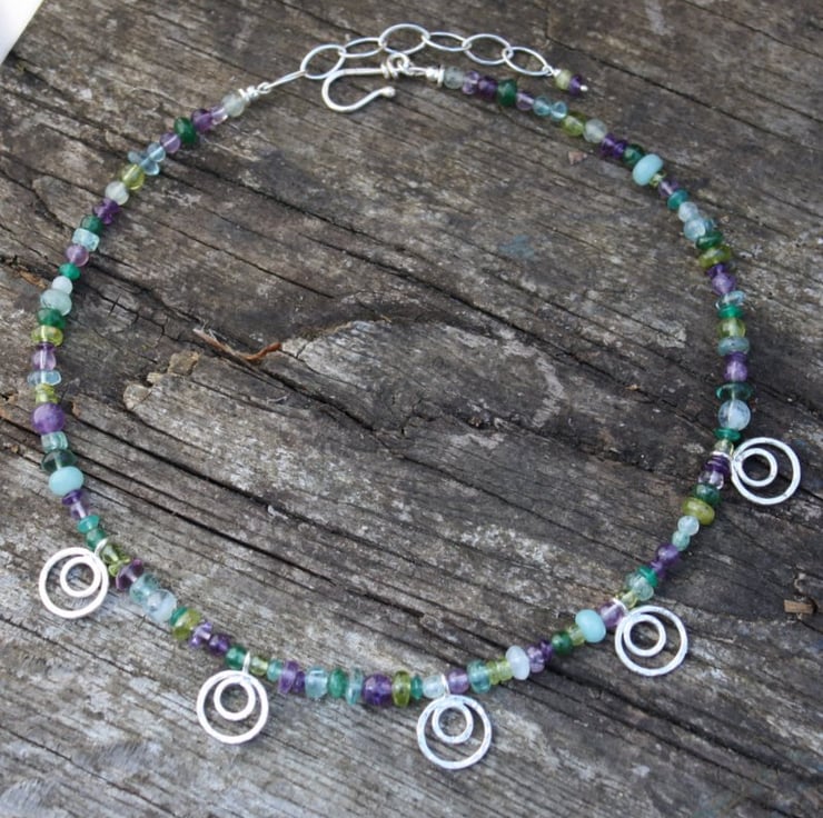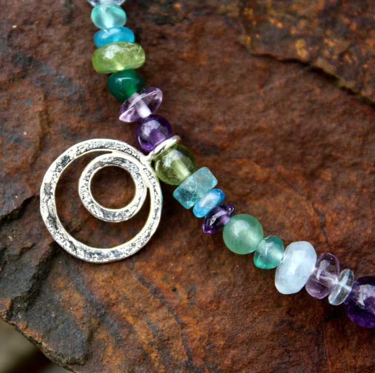 A beautiful selection of gemstones have been combined with handmade silver beads to make this eye catching necklace.