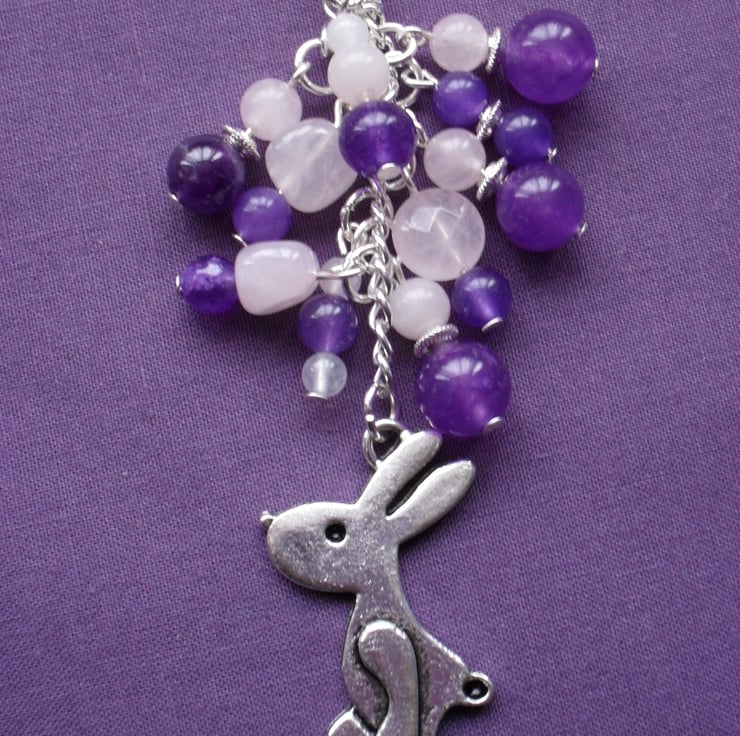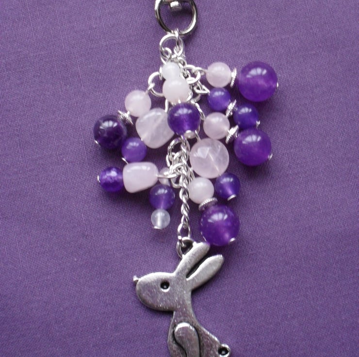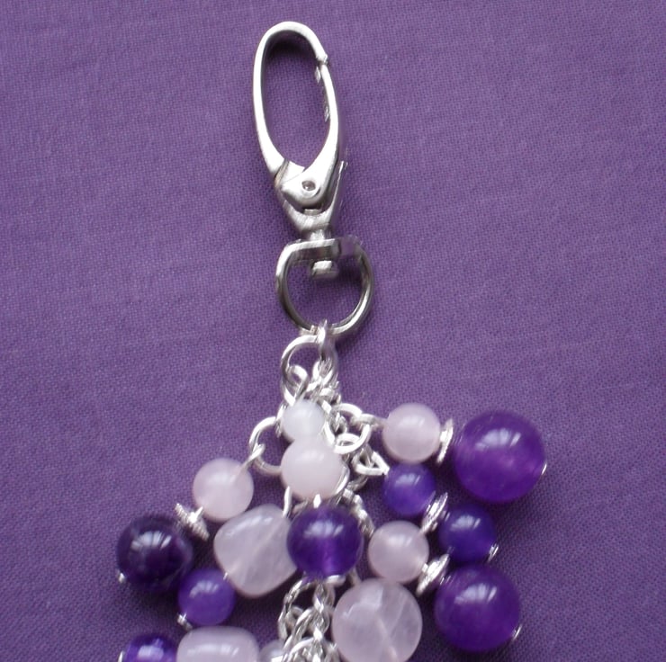 Bag charm with rose quartz ,purple semi precious gemstones and some silver plated beads are attached to a silver tone chain and clasp.