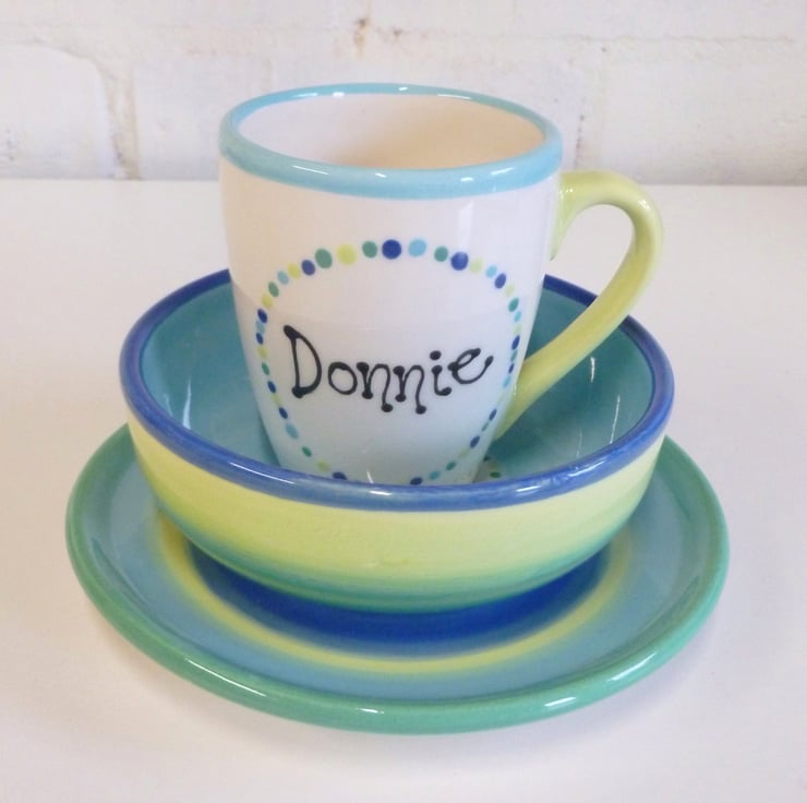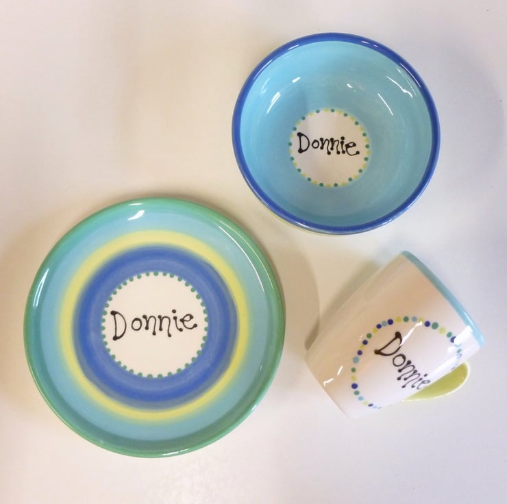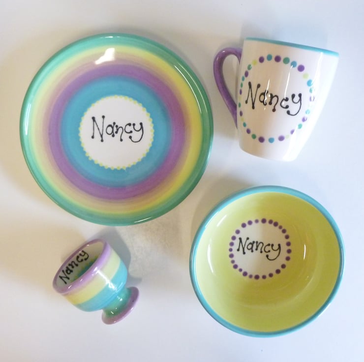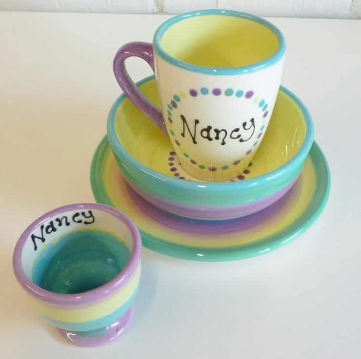 This personalised set comprises a child-sized Plate, Bowl, Mug and Egg Cup. Each set is hand painted, glazed and kiln-fired. Therefore it can be made to any colour combination and personalised with the child's name or for a specific occasion.