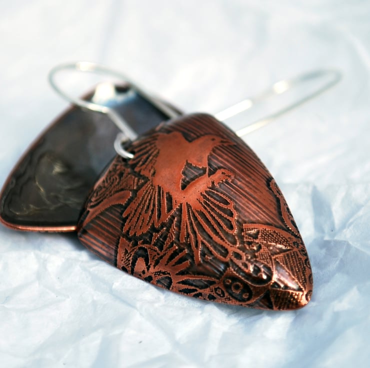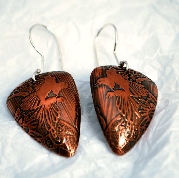 Exquisitely etched copper earrings with a flying magpie motif in a swirling, patterned stylized aky. The have been domed into a triangular shape, then oxidised to sanded to emphasise the image before being polished to a super shine. Earwires are sterling silver.